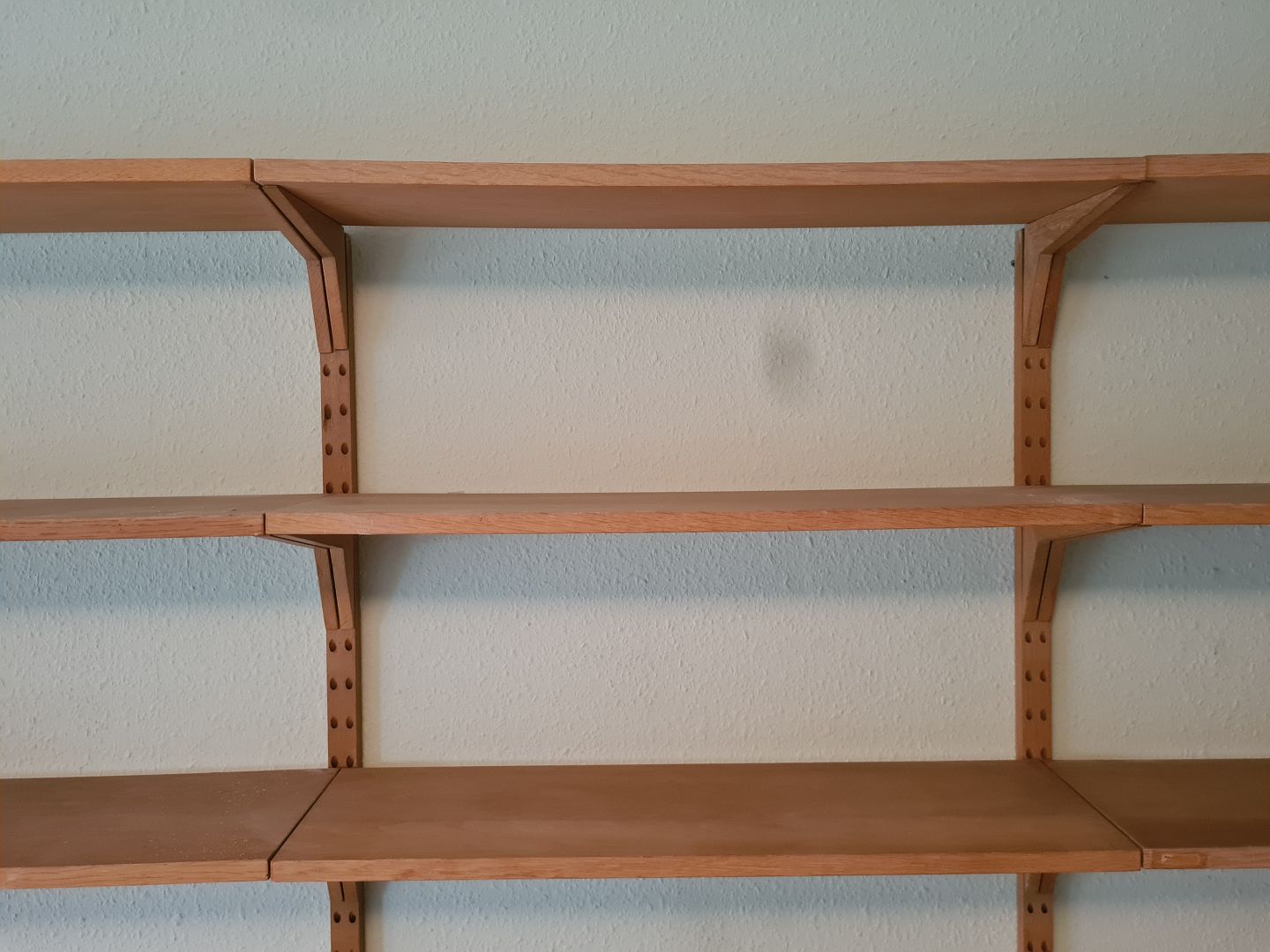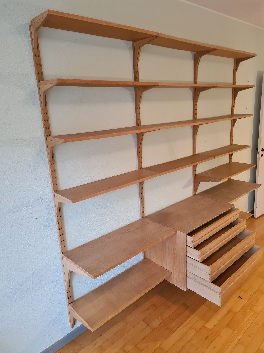 Cado vægreolsystem fra 1960'erne i eg designet af Poul Cadovius. Sættet består af 1 kommode (HxBxD 52x80x38), 2 hylder (HxBxD 2x80x38), 3 hylder (HxBxD 2x80x30), 12 hylder (HxBxD 2x80x33) og 4 vanger til ophængning. Generelt i pæn brugt stand dog svajer et par hylder en anelse. (Billede)Emne nummer: 60674