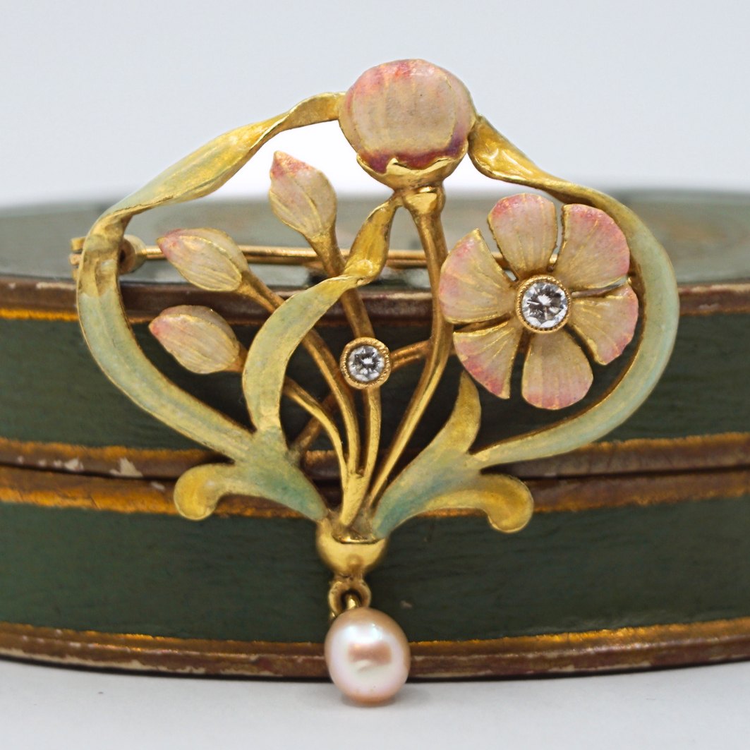 Art nouveau broche i 18 kt. guld med emalje, to diamanter og en perle. Fra 1900-1910.H. 3,8 cm. L. 3,3 cm.