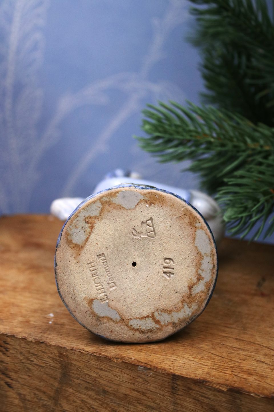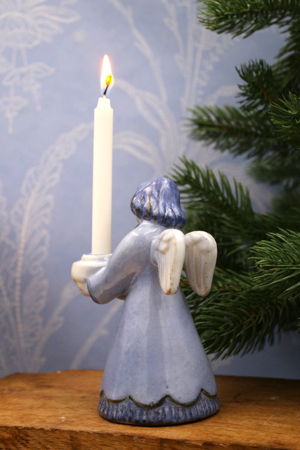 L. Hjorth keramik stor engel med blå glasurder holder et lille stearinlys. Nr.419.