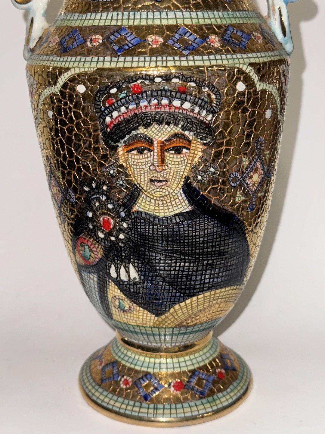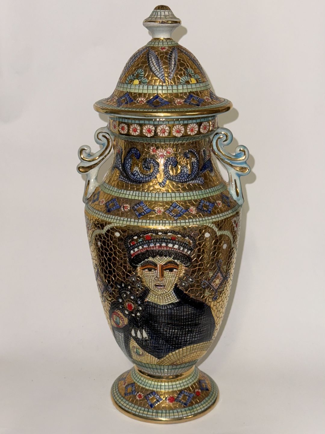 Deruta mosaik krukke med hanke og låg i majolika fremstillet i Umbrien i Italien. Motiv med afbildning af kejserinde Theodora, kejser Justinians byzantinske hustru fra det sjette århundrede, senere kanoniseret af den østlige ortodokse kirke som Saint Theodora. På bagsiden motiv med påfugl. Mosaik-designet er indgraveret med hånden, direkte på vasen, i stedet for små påsatte stykker. Emnet har et meget farvestærkt udtryk med metallisk overflade. Fremstår i god stand. Fabrikamærket på bunden. H. 33,5 cm inklusiv låg.v/ Jesper Reutemann