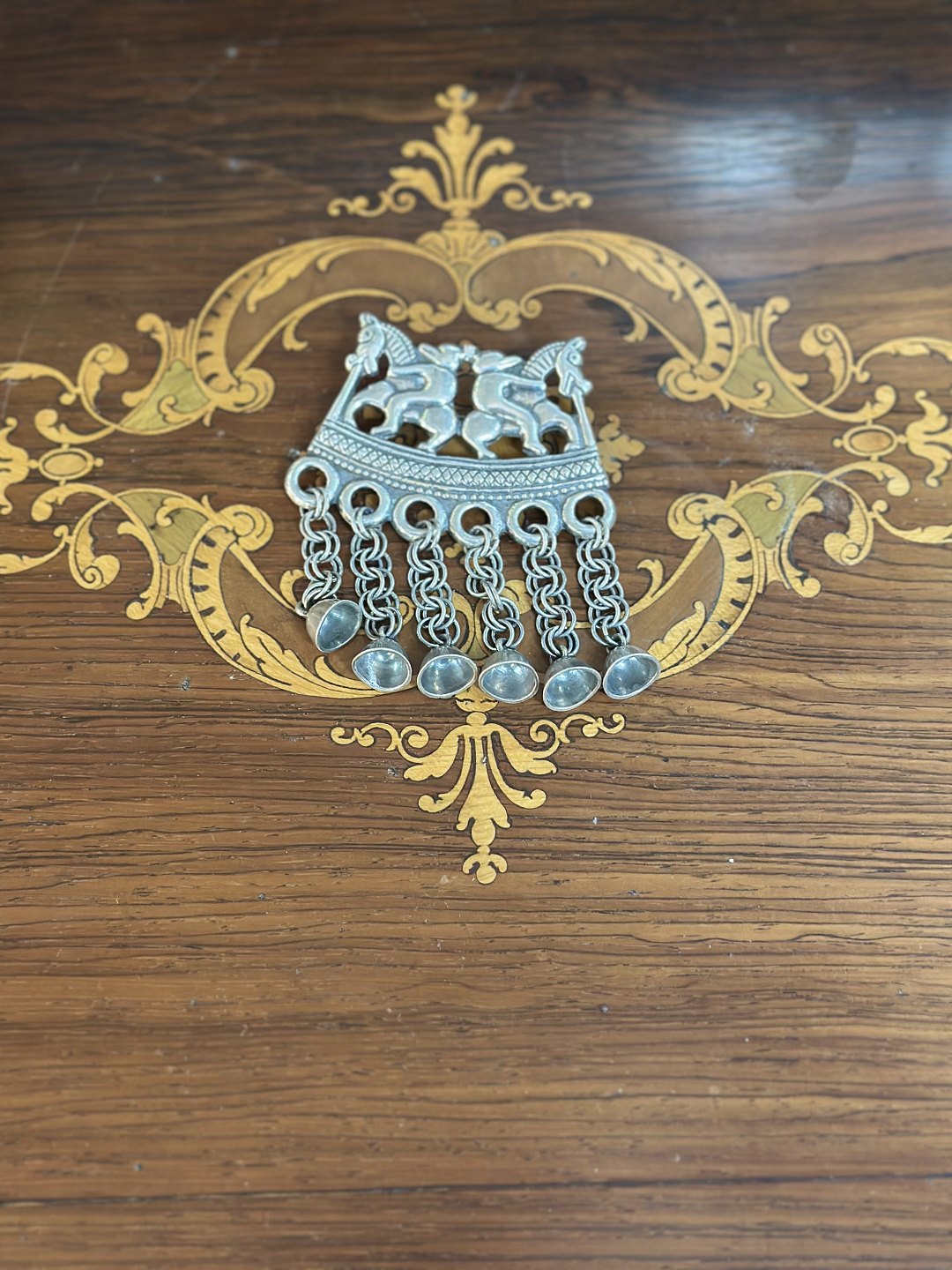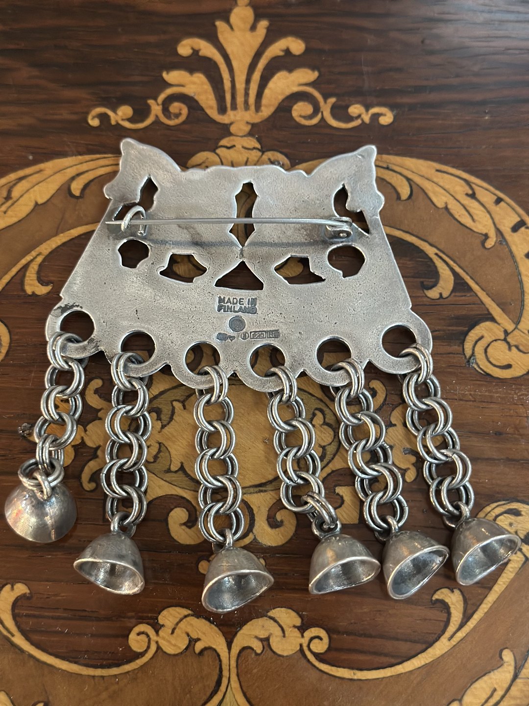 Vintage og meget stærkt smykket er lavet af kalevala Krou Finlands mest kendte smykkefirmaer .Broche inspireret af amuletter som skulle bringe held og beskytte mod onde ånder