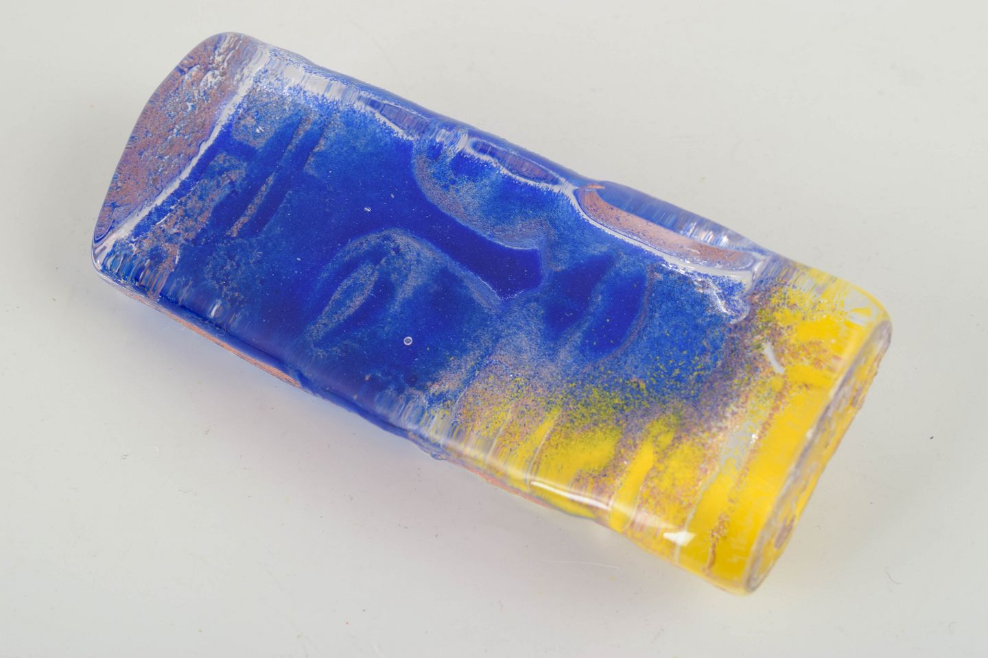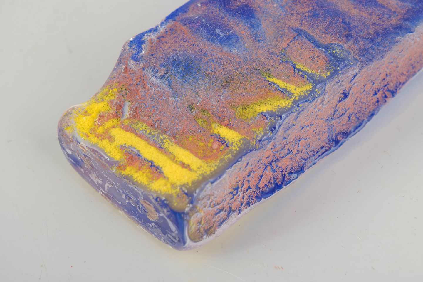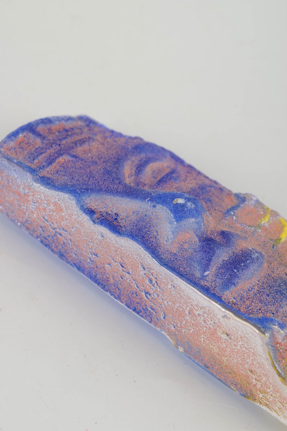 Rektangulær glasrelief med abstrakt ansigtsmotiv i stærke blå, lilla og gule nuancer. Værket udviser Björn Ekegrens karakteristiske kombination af form, farve og lys, hvor det håndlavede glas får en næsten skulpturel dybde og stoflighed.