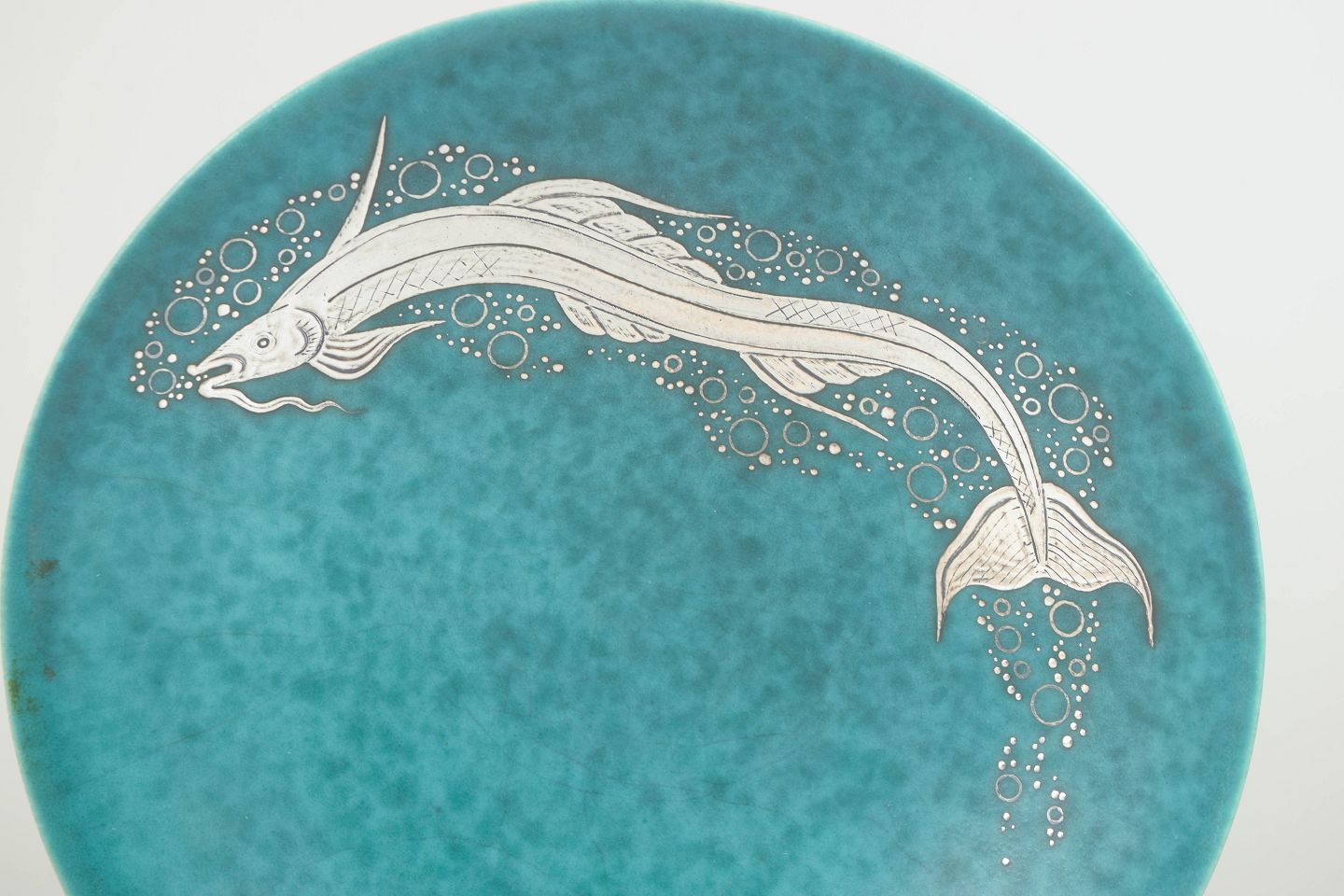 Lav skål i turkisgrøn glasur med sølvindlagt motiv af fisk i bevægelse. Et klassisk eksempel fra Kåges berømte Argenta-serie, hvor den metalliske sølvdekoration elegant kontrasterer den dybe grønblå glasur.