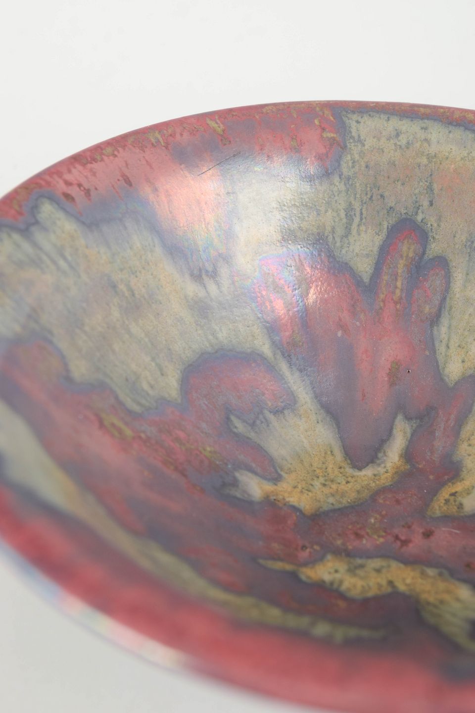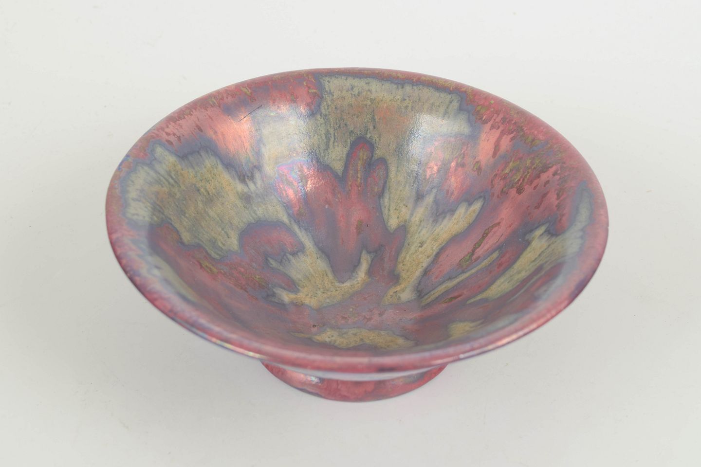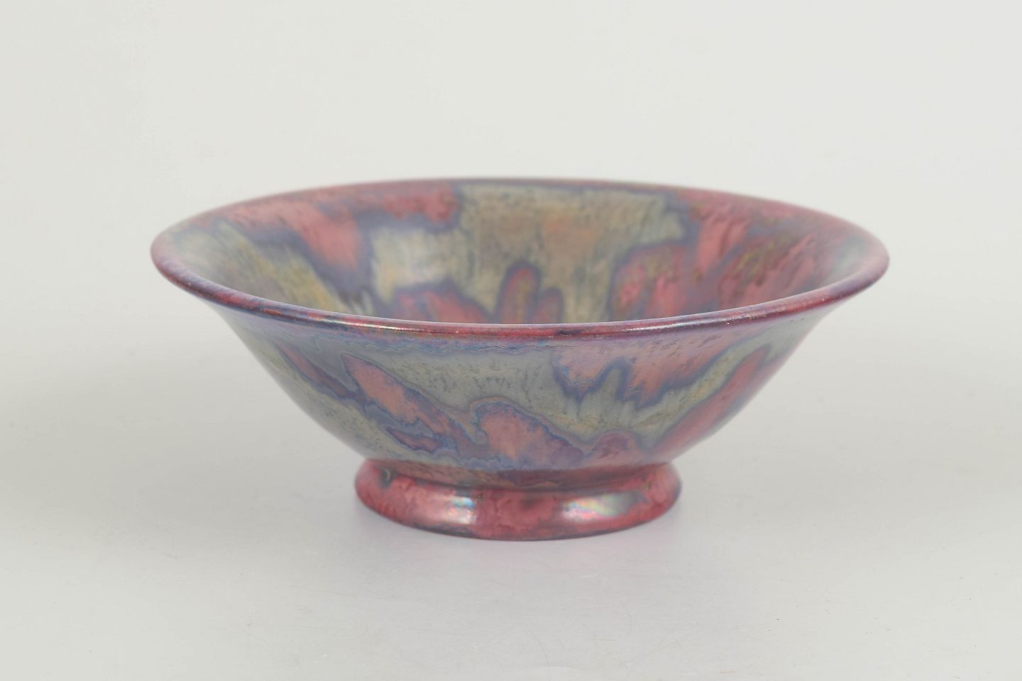 Hånddrejet stentøjsskål på lille fod med udsvajet kant og eksperimenterende flerfarvet glasur i nuancer af rosa, blå, lilla og grøn. Et karakteristisk eksempel på Anderssons arbejde for Höganäs under 1970’erne, hvor han kombinerede traditionelle former med kunstneriske glasureffekter.