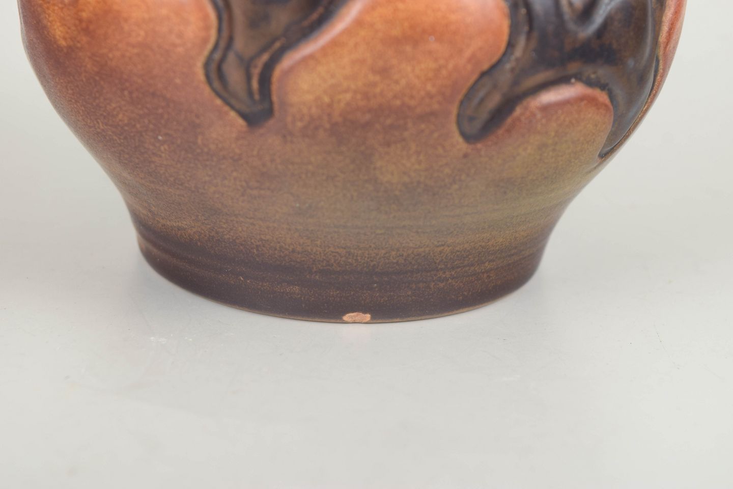 Ipsens Enke vase, model 509, ca. 1910/20’erne.Art Nouveau-vase i glaseret keramik med karakteristisk plastisk reliefdekoration i mørkebrun glasur over varm gylden-orange bundglasur. En elegant og klassisk formgivning fra perioden, med tydelig inspiration fra naturens organiske former.
