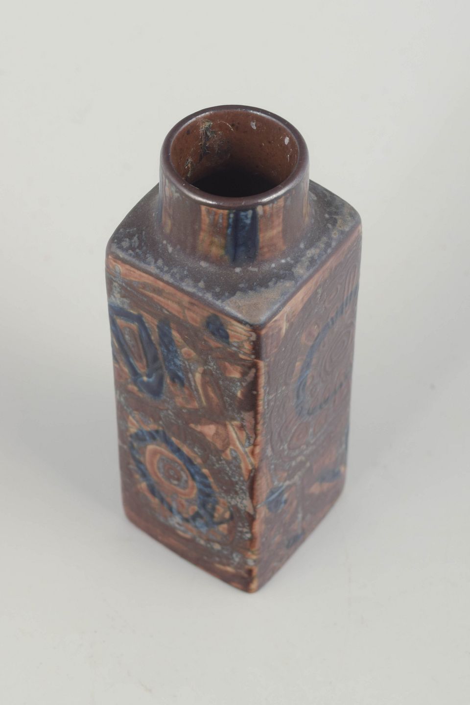 Rektangulær vase i stentøj med karakteristisk reliefdekoration i blå og brunlige nuancer fra Thorssons Baca-serie. Den geometriske form kombineret med det organiske mønster skaber et markant og tidstypisk udtryk for dansk design i perioden.