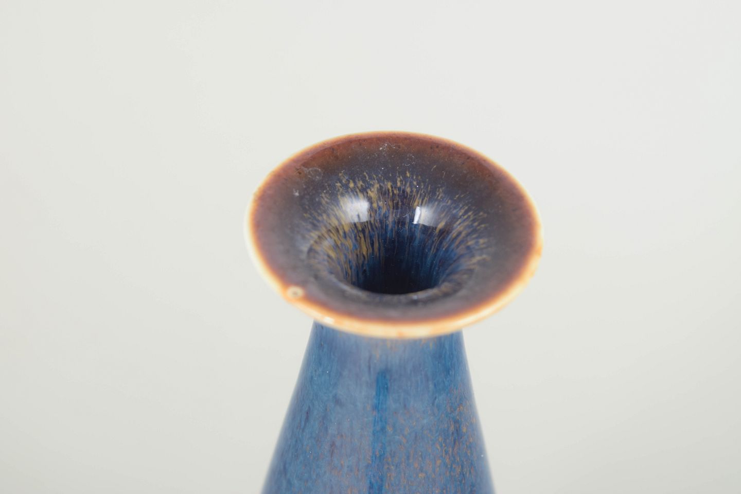 Slank, dråbeformet vase i stentøj med glansfuld blå glasur i levende nuancer fra dyb kobalt til lysere blå toner. Den elegante, organiske form og den fine glasurforløb er karakteristisk for Stålhane’s arbejde i 1950’erne og 60’erne.