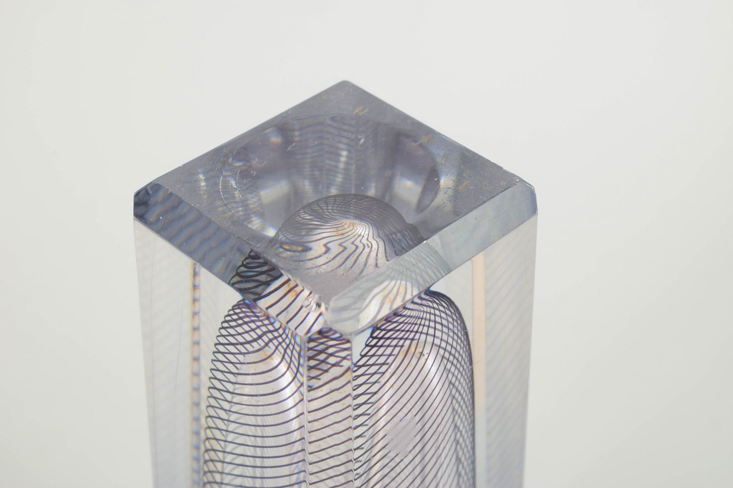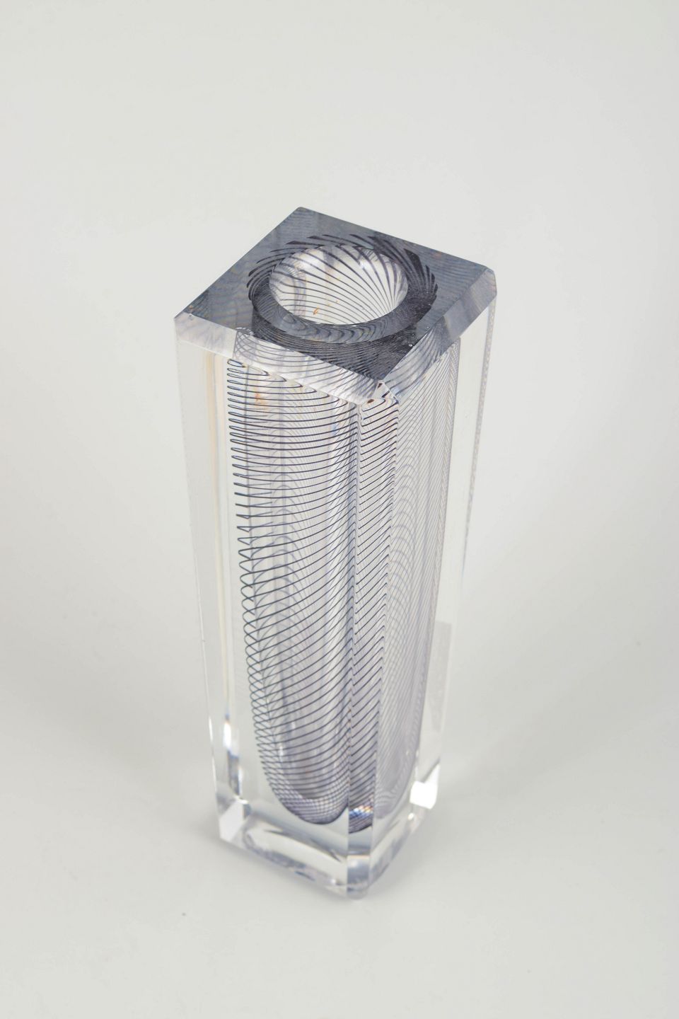Optisk vase udført i massivt klart glas med indlagt spiralformet sort mønster, slebne og polerede flader. Et sofistikeret eksempel på Lindstrands sene design for Kosta Boda, hvor teknisk præcision og visuel bevægelse mødes i et skulpturelt formsprog.