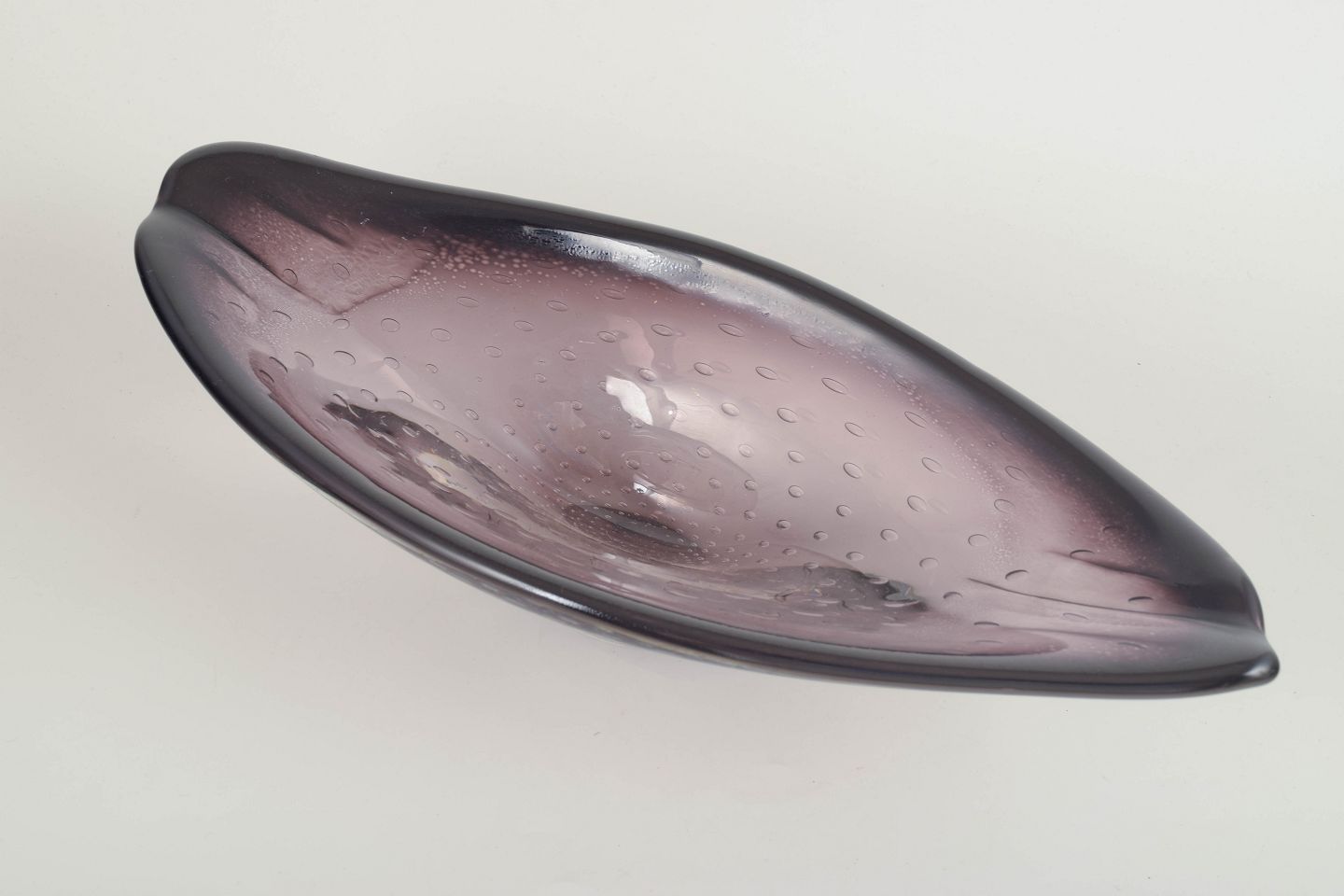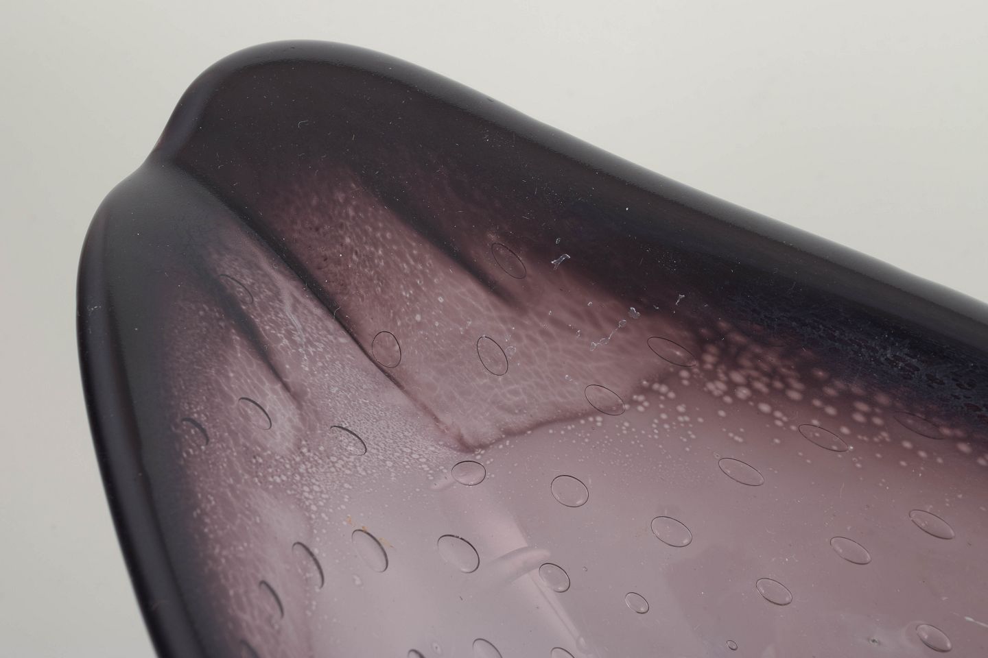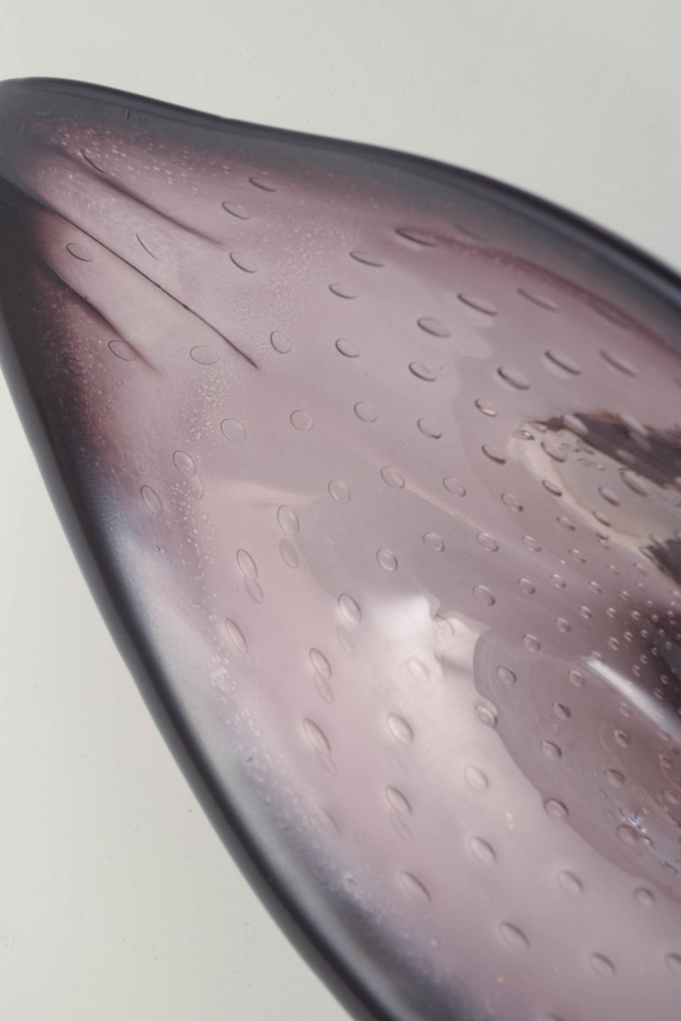 Stor, fritformet skål i mundblæst glas med klart og violettone glas med indlagte luftbobler og optisk struktur. Et elegant og skulpturelt stykke svensk studioglas fra 1970’erne, udført med teknisk præcision og sans for formens bevægelse.