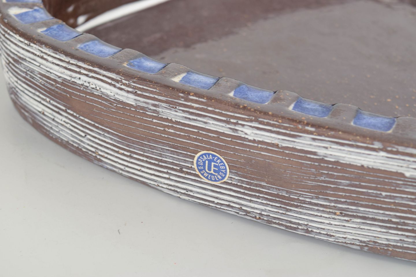 Low triangular ceramic dish with a brown base, white-washed structure and blue decorative rim – a fine example of Simmulson’s organic forms and subtle mid-century palette.