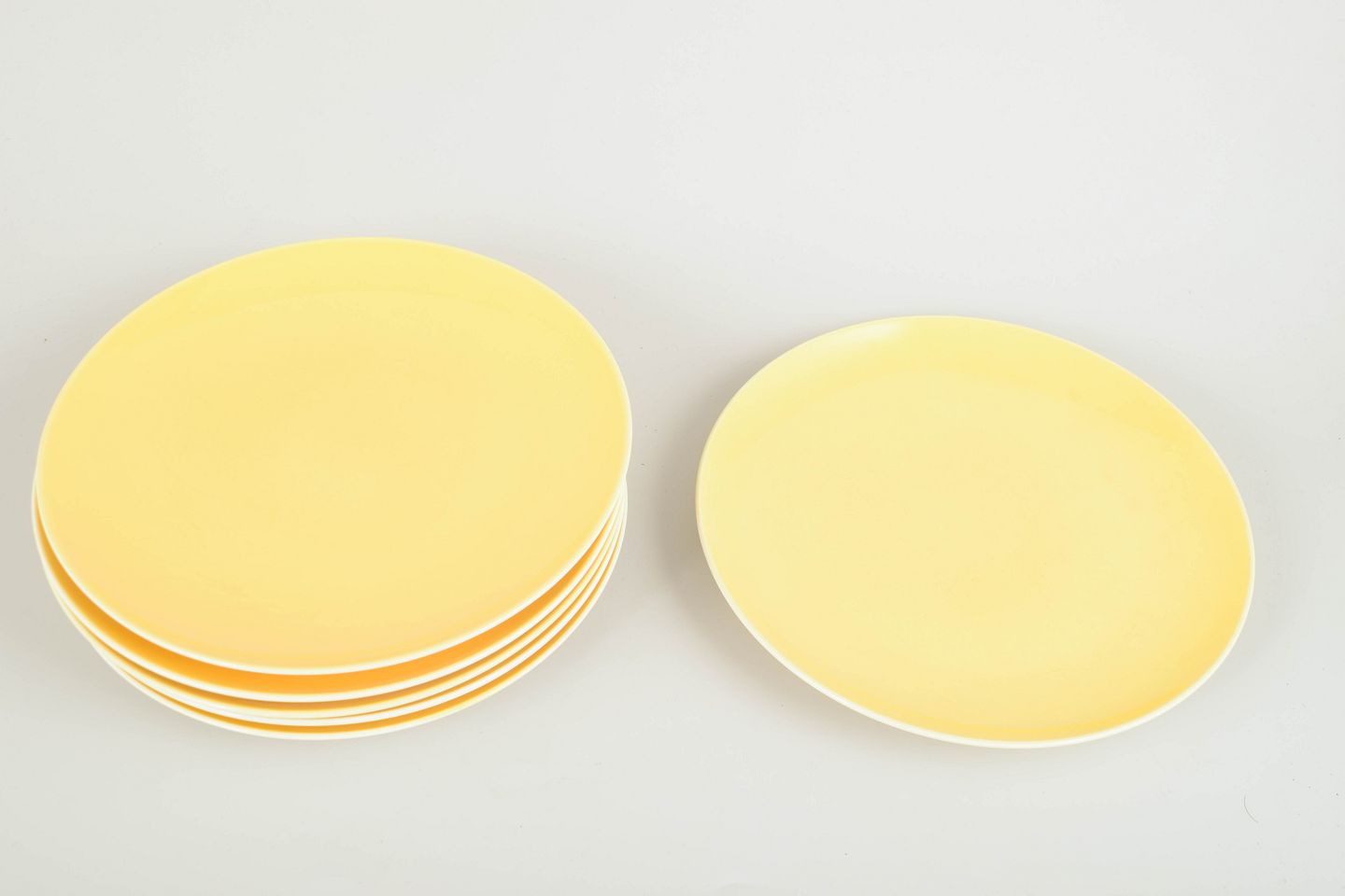 Sæt af seks "Susanne" middagstallerkener i fajance fra Aluminia i den karakteristiske gule “Confetti”-glasur. Enkel og tidstypisk formgivning med bløde linjer og glat overflade – et klassisk eksempel på dansk funktionalistisk design fra perioden.