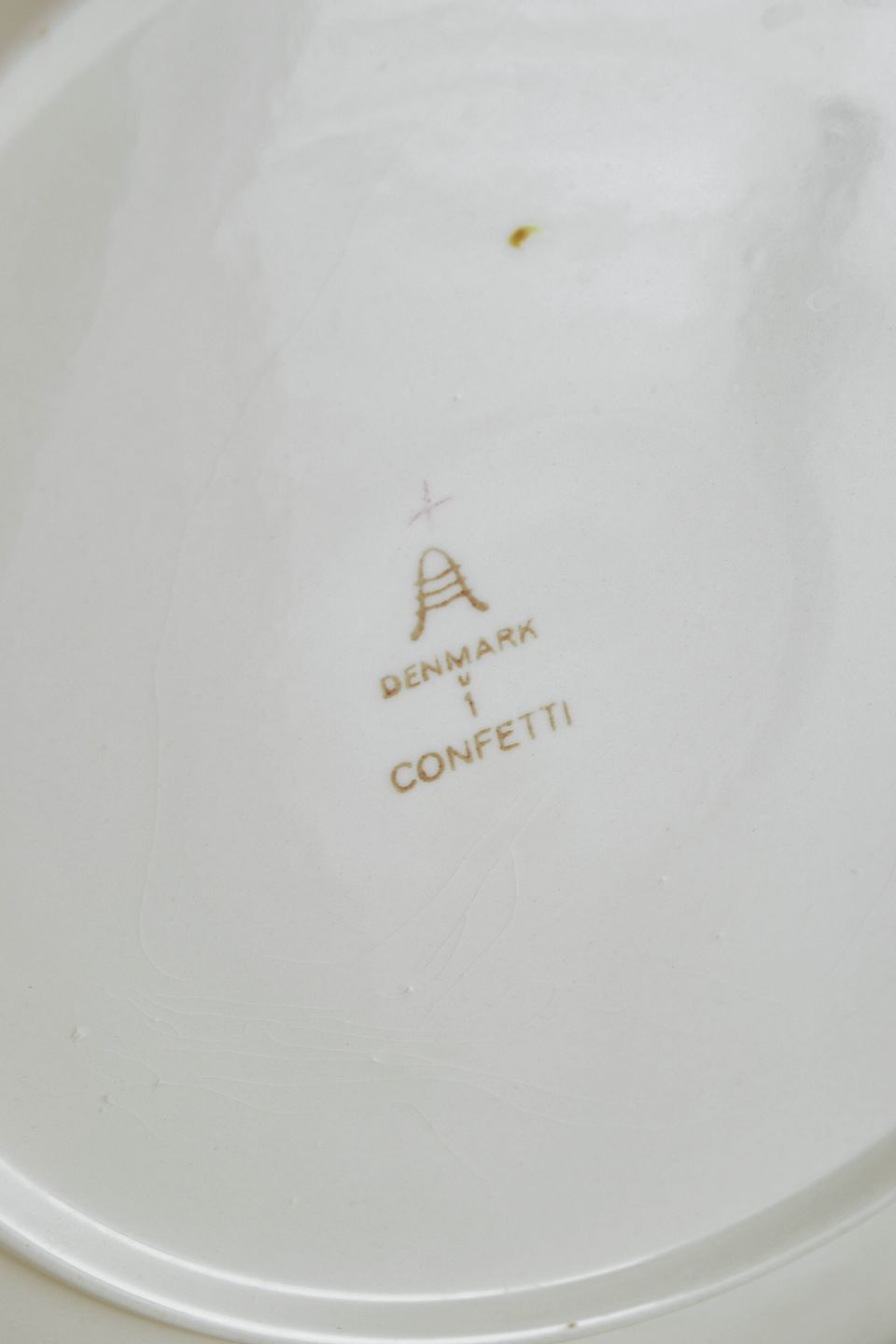 Aluminia blev grundlagt i 1863 og blev i 1882 en del af Royal Copenhagen. I midten af det 20. århundrede lancerede fabrikken en række farverige serier som “Confetti”, der kombinerede funktionel formgivning med livlige farvetoner. Serien blev et symbol på dansk efterkrigsmodernisme og er i dag eftertragtet blandt samlere for sit lyse og tidløse udtryk.