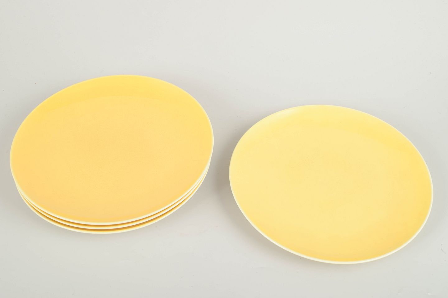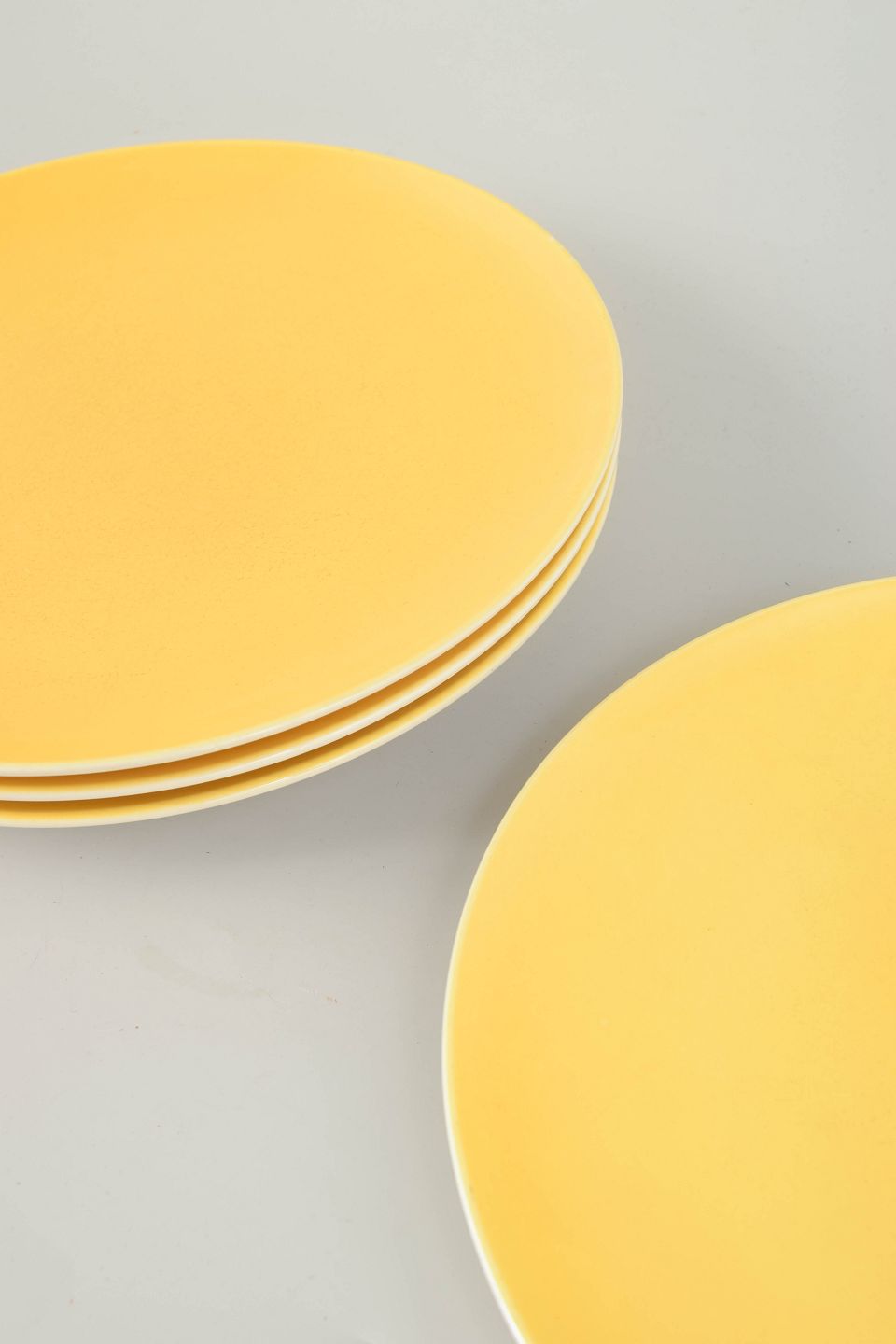 Sæt af fire "Susanne" middagstallerkener i fajance fra Aluminia i den karakteristiske gule “Confetti”-glasur. Enkel og tidstypisk formgivning med bløde linjer og glat overflade – et klassisk eksempel på dansk funktionalistisk design fra perioden.