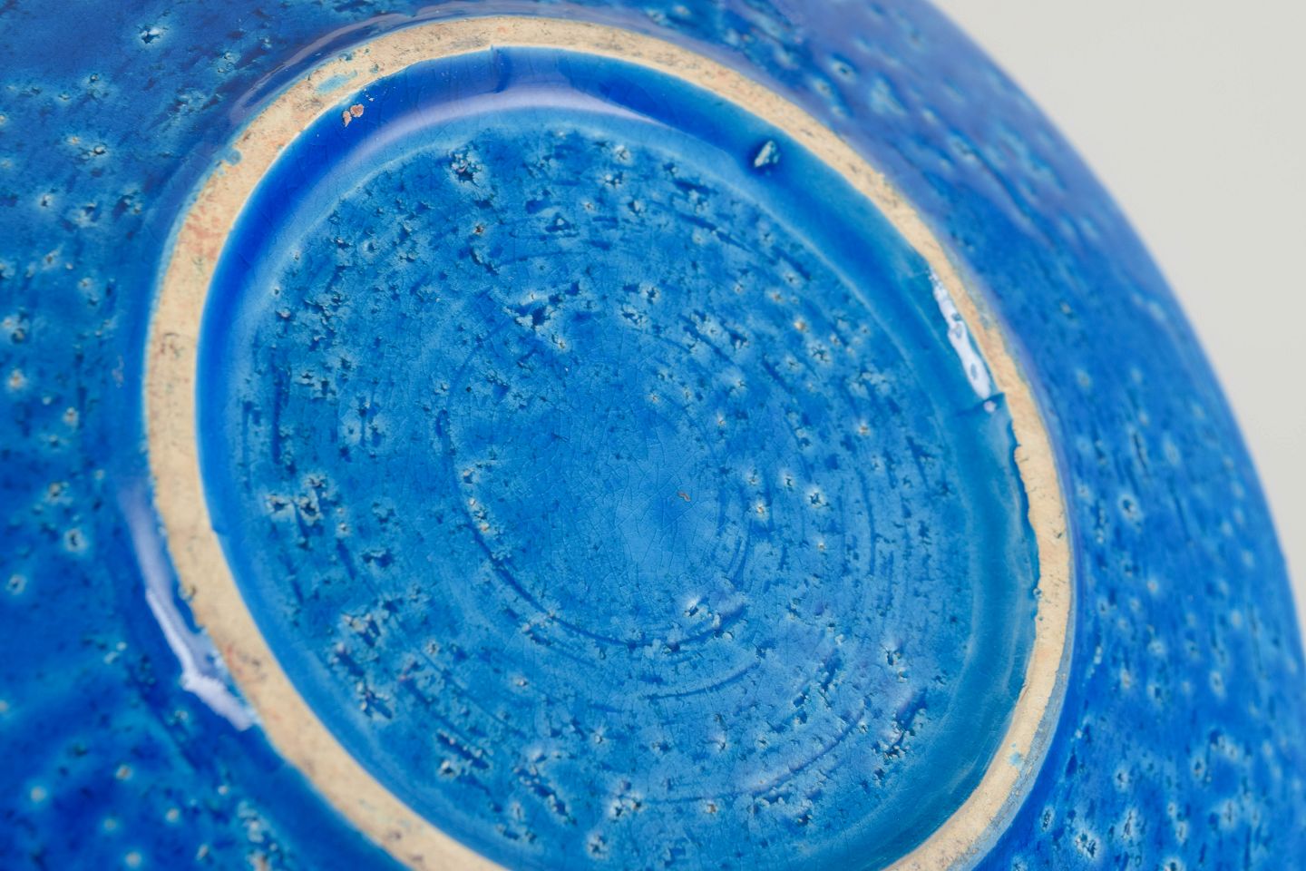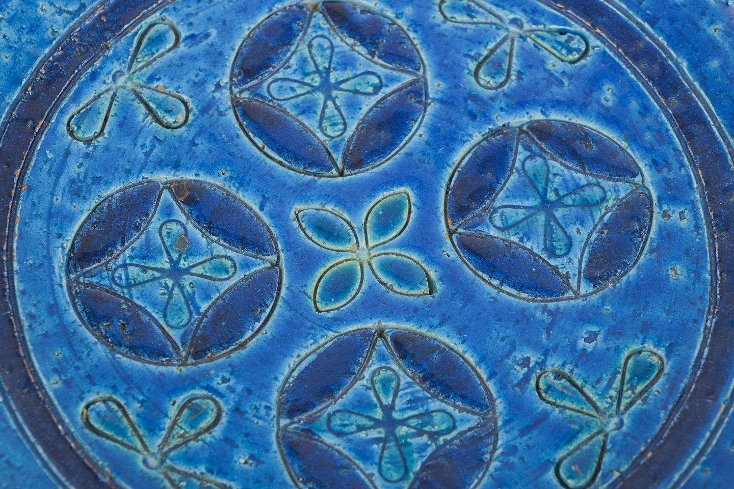 Dekorativ lav skål i keramik med reliefdekoration og karakteristisk “Rimini Blu”-glasur i klare blå og turkise nuancer. Et klassisk eksempel på Aldo Londis ikoniske design for Bitossi, hvor håndglaserede overflader og geometriske mønstre kombineres i en levende, skinnende farvepalet.