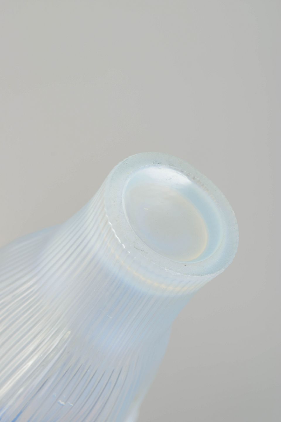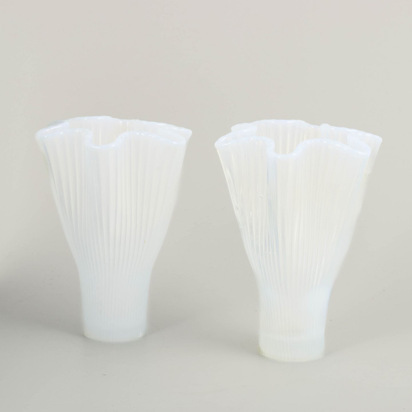 Et par mundblæste vaser i opaliseret glas fra serien “Reffla”, designet af Arthur Percy for Gullaskruf. Serien kendetegnes ved sine riflede sider og blødt bølgende kanter, som fremhæver glasset med et elegant spil mellem lys og transparens.