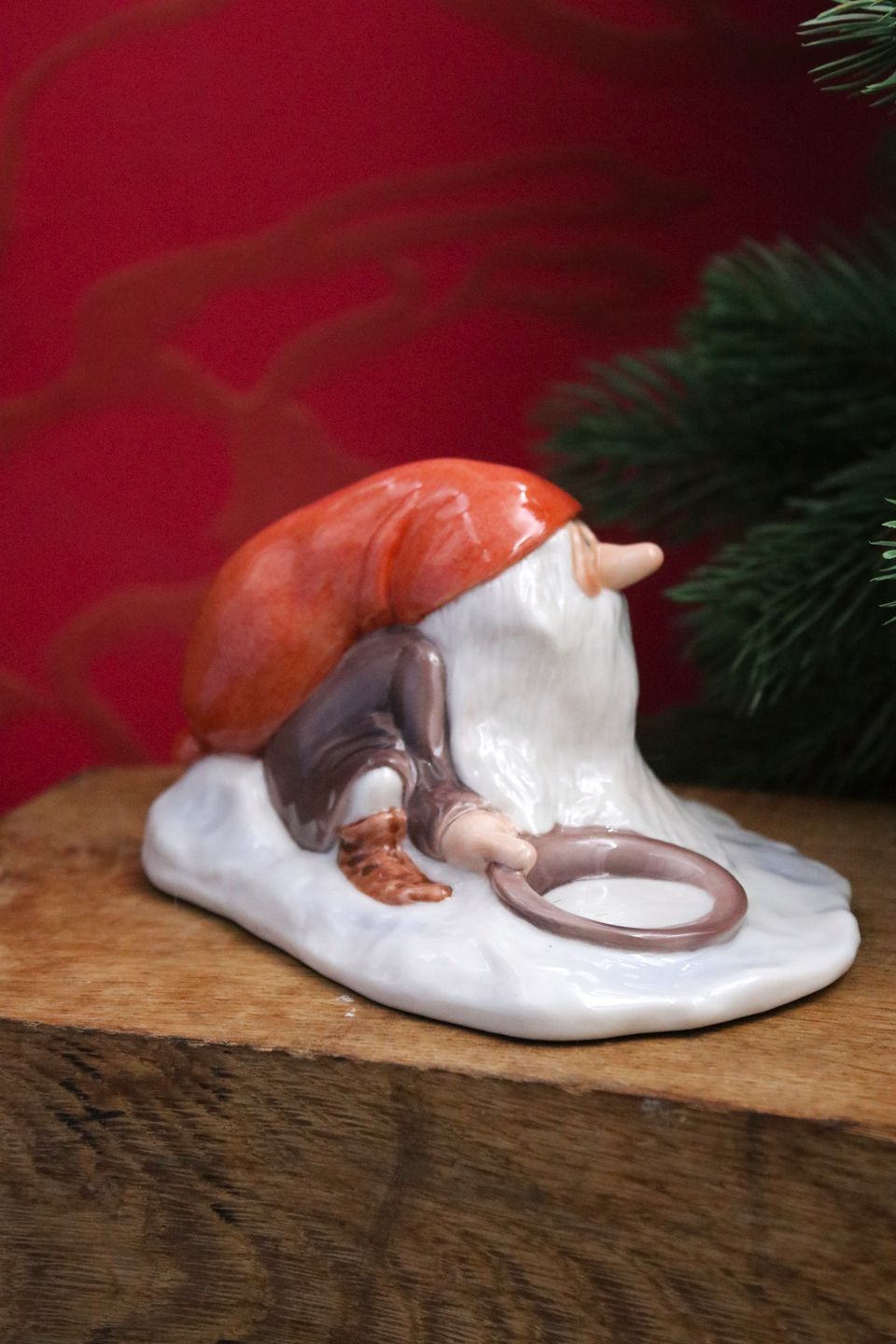 Royal Copenhagen jule porcelæns figur af julenisse med grødskållavet af Harald Wiberg. H:8cm. / 13,5x10cm.