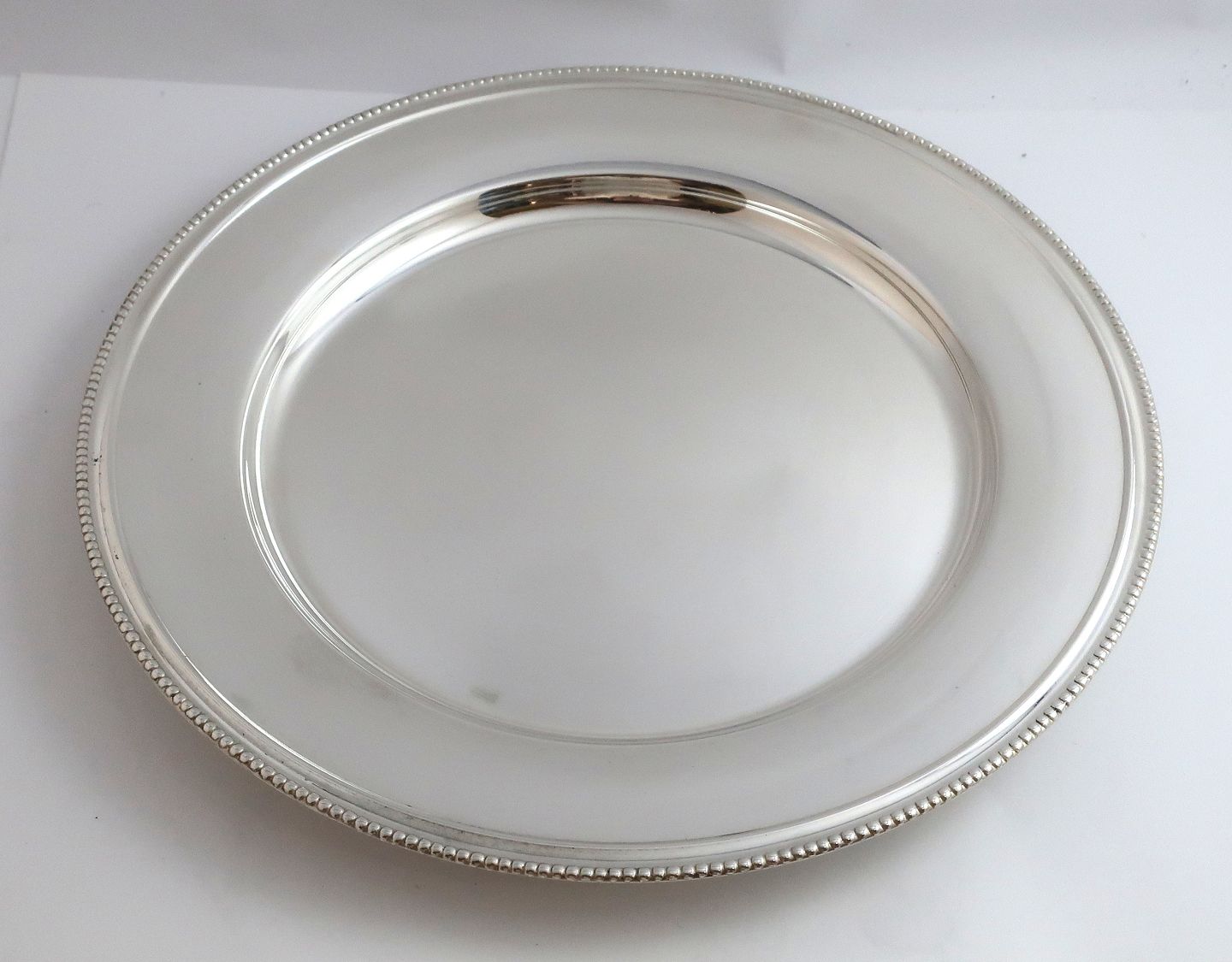 12 styk sølvplet dækketallerkner med perlekant. Diameter 28 cm. Brugsspor på et par stykker. Udstiller