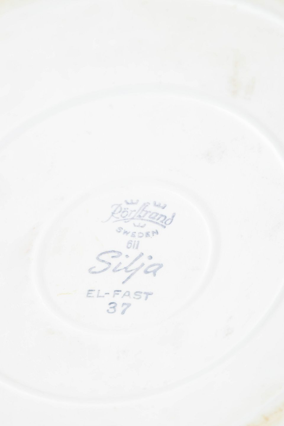 Dekoreret med Westmans karakteristiske retroblomstermotiv i blå og rosa på hvid bund. Serien Silja blev produceret som del af Rörstrands “El-Fast” stentøj – praktisk, varmebestandigt og dekorativt på bordet.