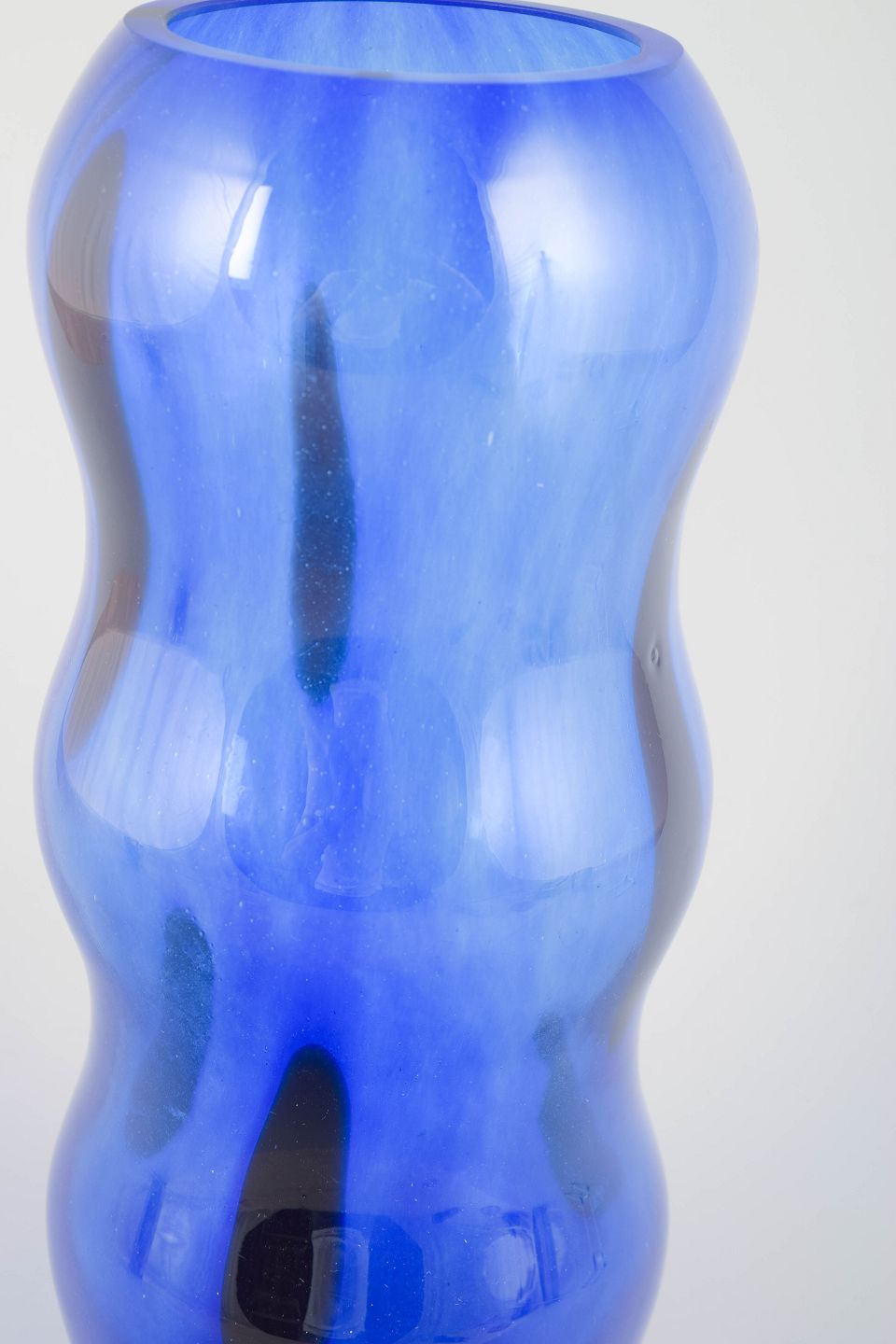 Organisk formet vase i blåt gennemfarvet glas med bløde, bølgende konturer, karakteristisk for Sahlin’s legende formsprog hos Kosta Boda i 1990’erne.