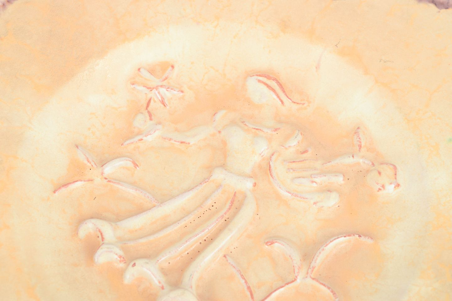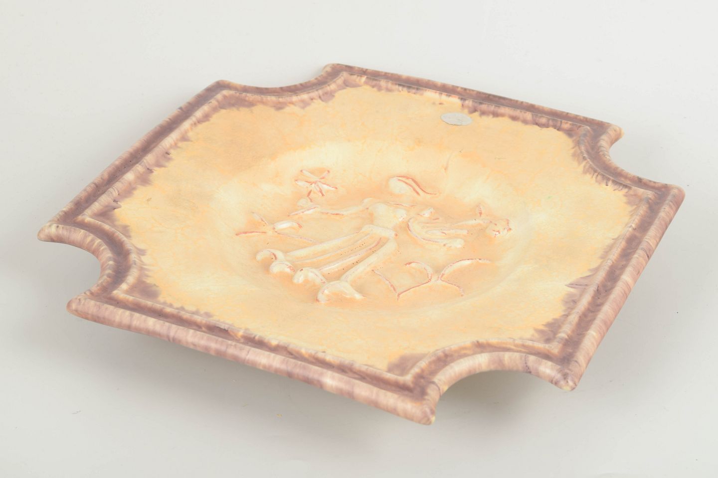 Kvadratisk keramisk fad med indpresset reliefmotiv af kvindefigur med blomster.