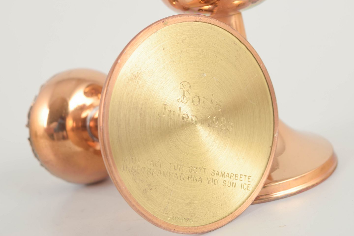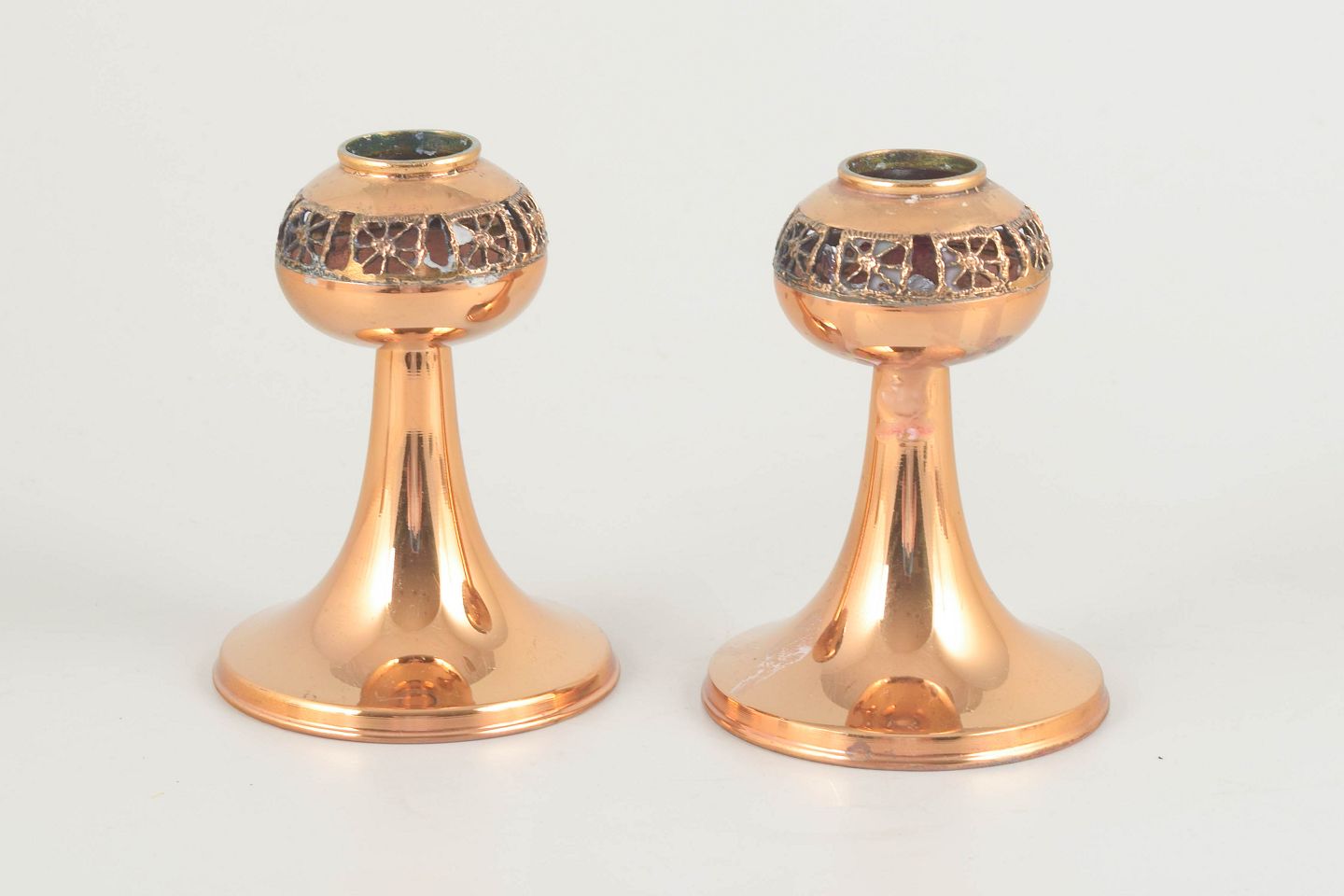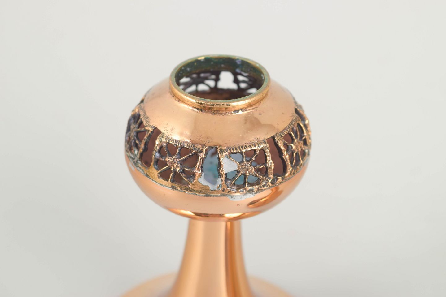 Elegant par lysestager i messing med dekorativ emalje i mørkegrønne og sorte nuancer omkring toppen. Den skulpturelle form fremhæver den nordiske modernismes raffinerede udtryk.
