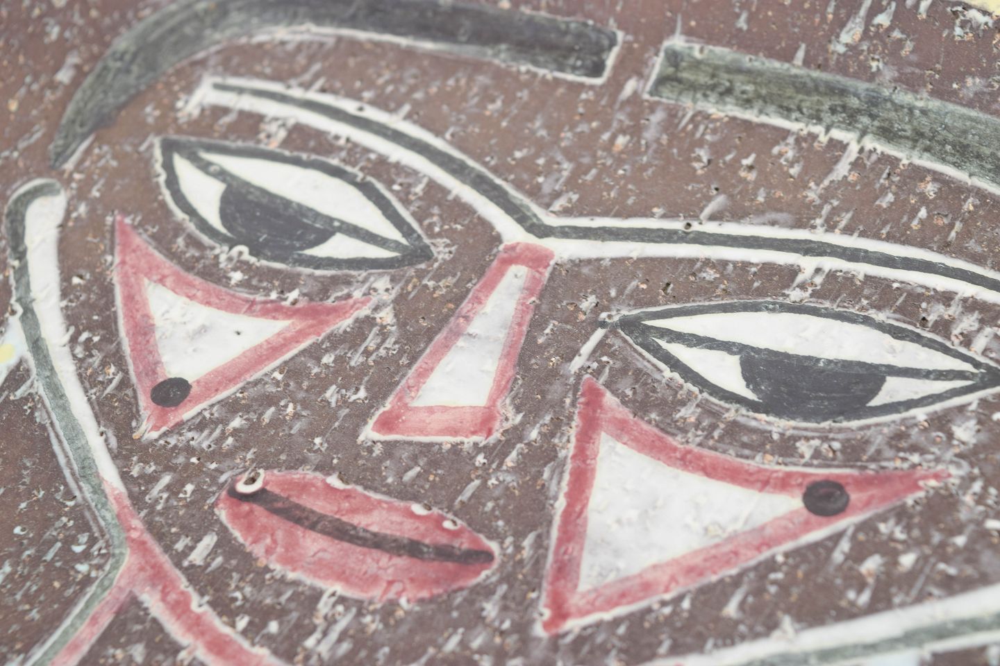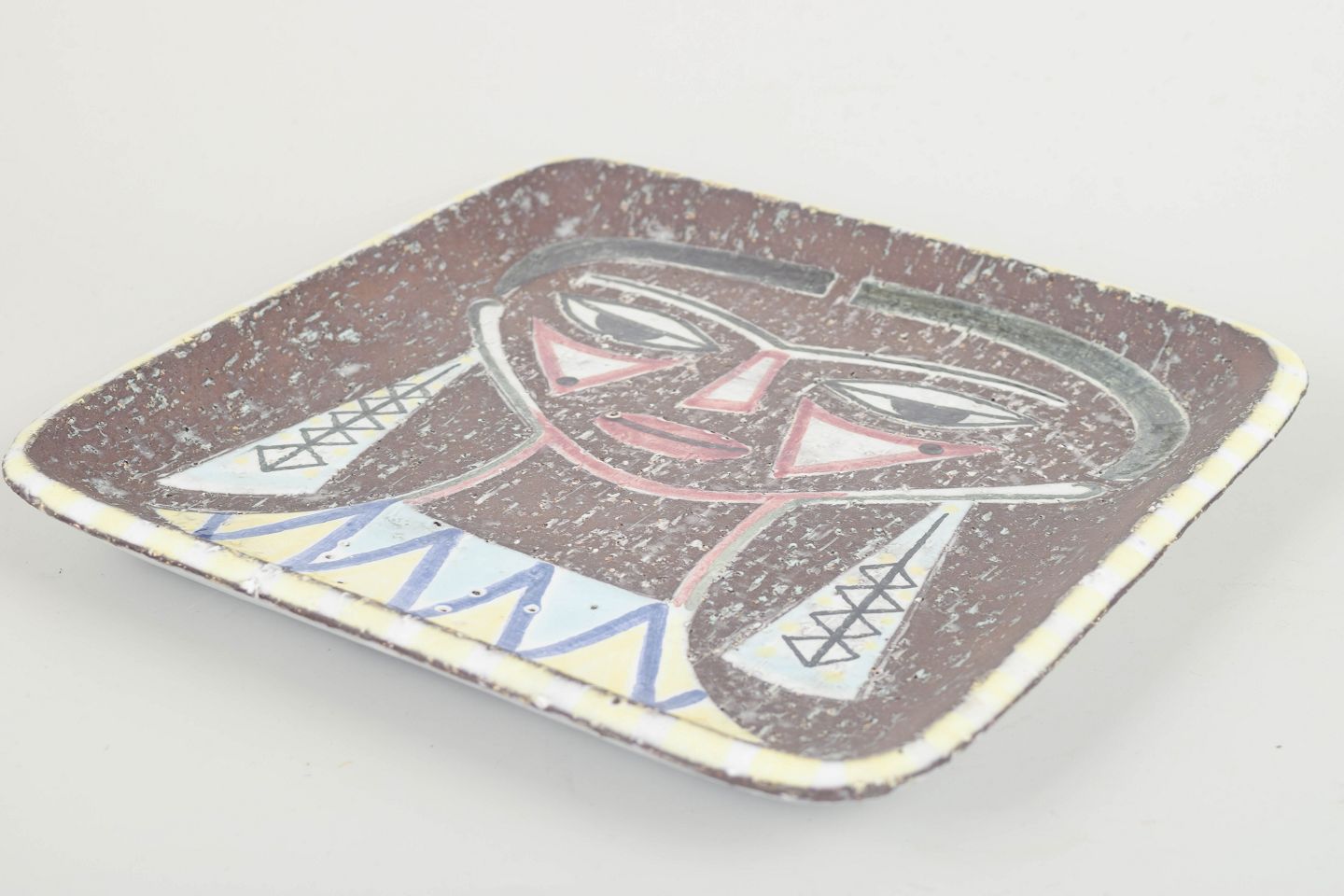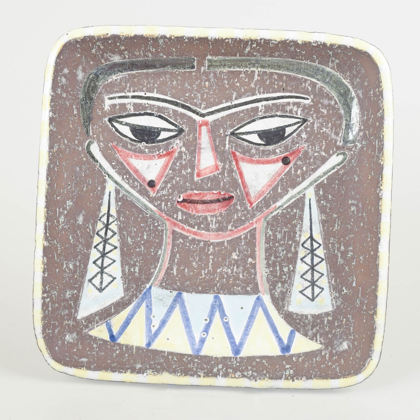Kvadratisk fad i glaseret stentøj med dekor af kvindehoved i geometriske former og stiliserede farver i brun, hvid, rød, blå og sort. Signeret på bagsiden.
