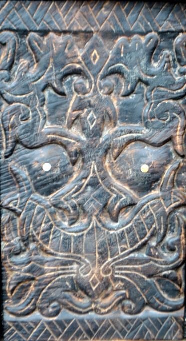 Afrikansk dør i træ med udskæringer. Med slå på bagside. H: 71,5 cm. B: 53 cm.Emne nummer: 28543