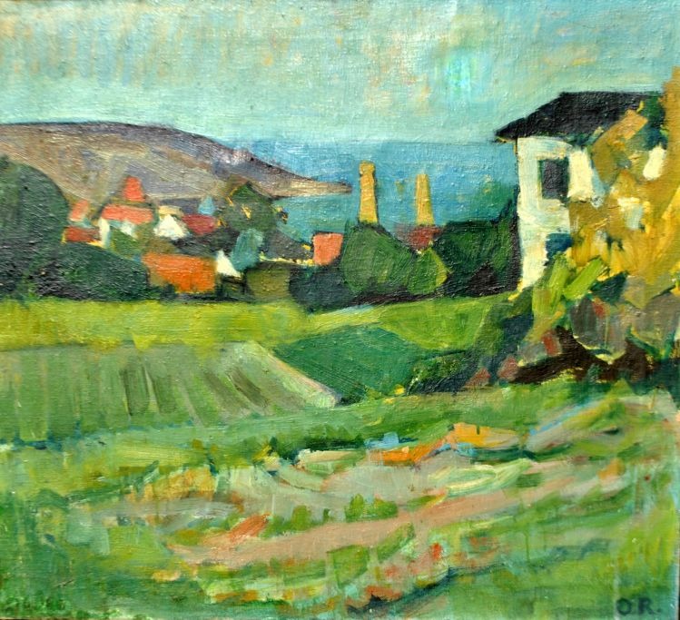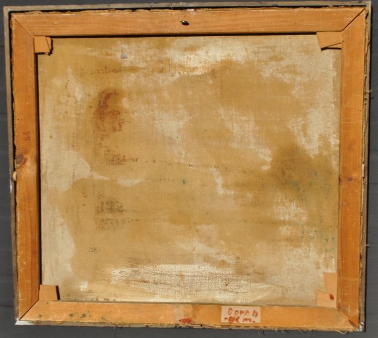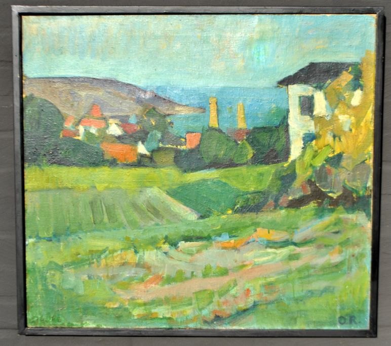 Dansk kunstner (20. årh.): Byparti - Bornholm. Olie på lærred. Signeret. O.R. 65 x 72 cm.Indrammet: 67 x 75 cm.