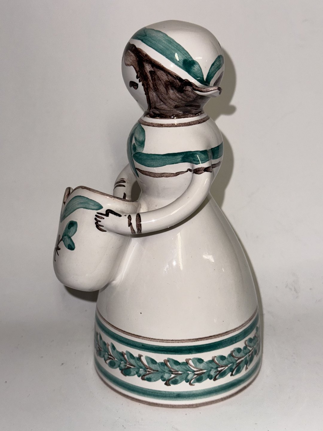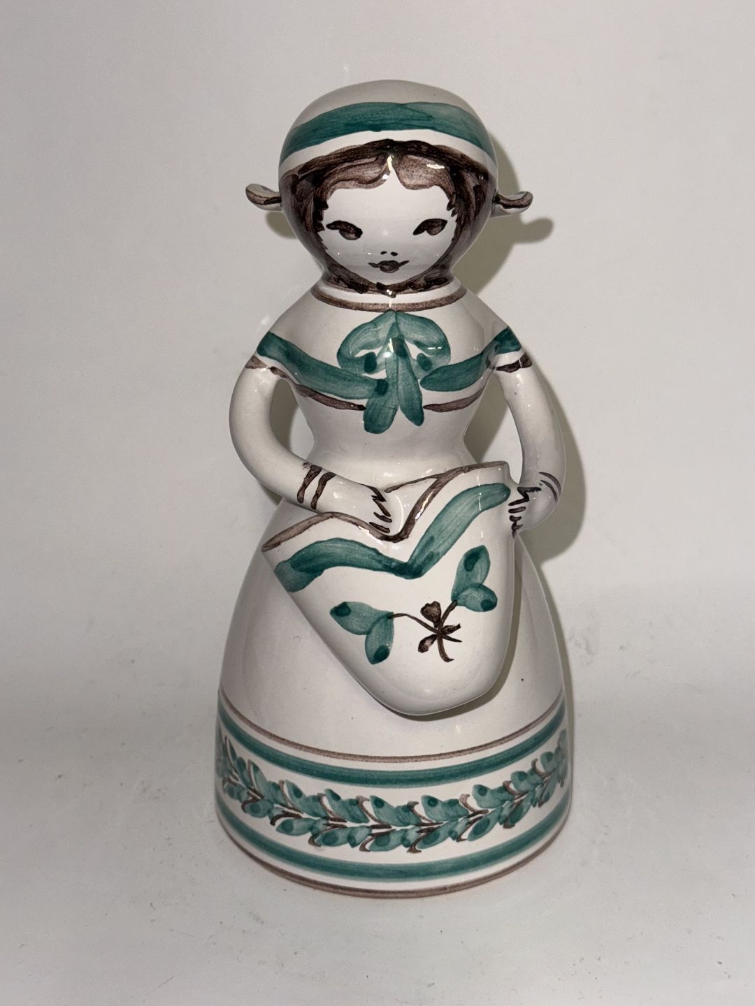 Figur i keramik fra Lars Syberg keramikfabrik i Taastrup. Designet af Alice Petersen. Hun kaldte disse pige-figurer for hendes dukker.Fremstår i fin stand. Lille overflade skrab på huen. Se foto med grå pil. Fabriksmærket på bunden. 18,5 cm høj.