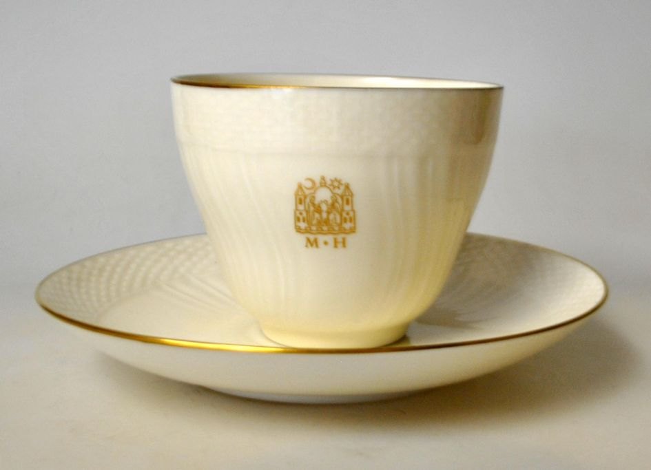Rare royal cup, Aarhus 1967. Denmark. Royal Copenhagen cream cup, curved with gold (frame 1235), No. 1870 with saucer. 2nd grading. Made in Copenhagen in 1966.The cup has the Aarhus City Coat of Arms and the initials: M - H on the side in gold.