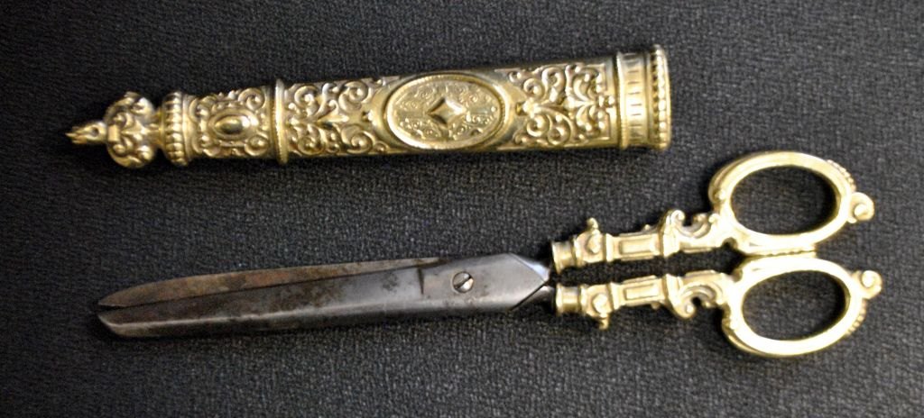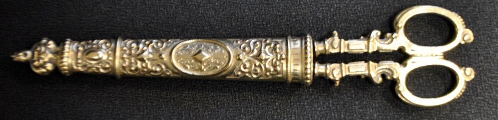 Messing saks i dekoreret messinghylster, 1880. L. 26,5 cm.Emne nummer: 28571