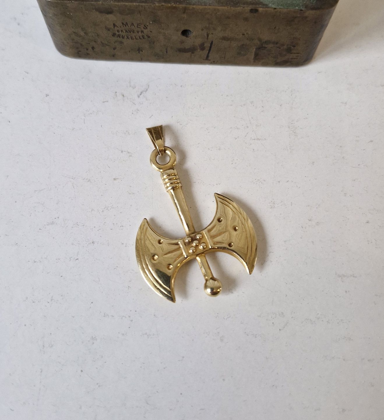 Græsk vedhæng i 14kt guld, udført som dobbeltøkse - Labrys.Øksen kendes fra Kreta - Knossos.