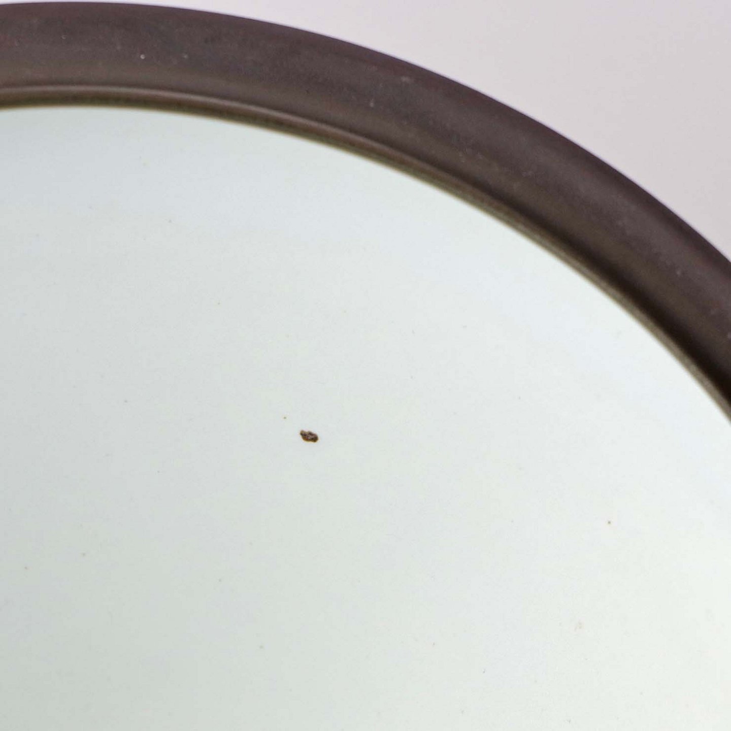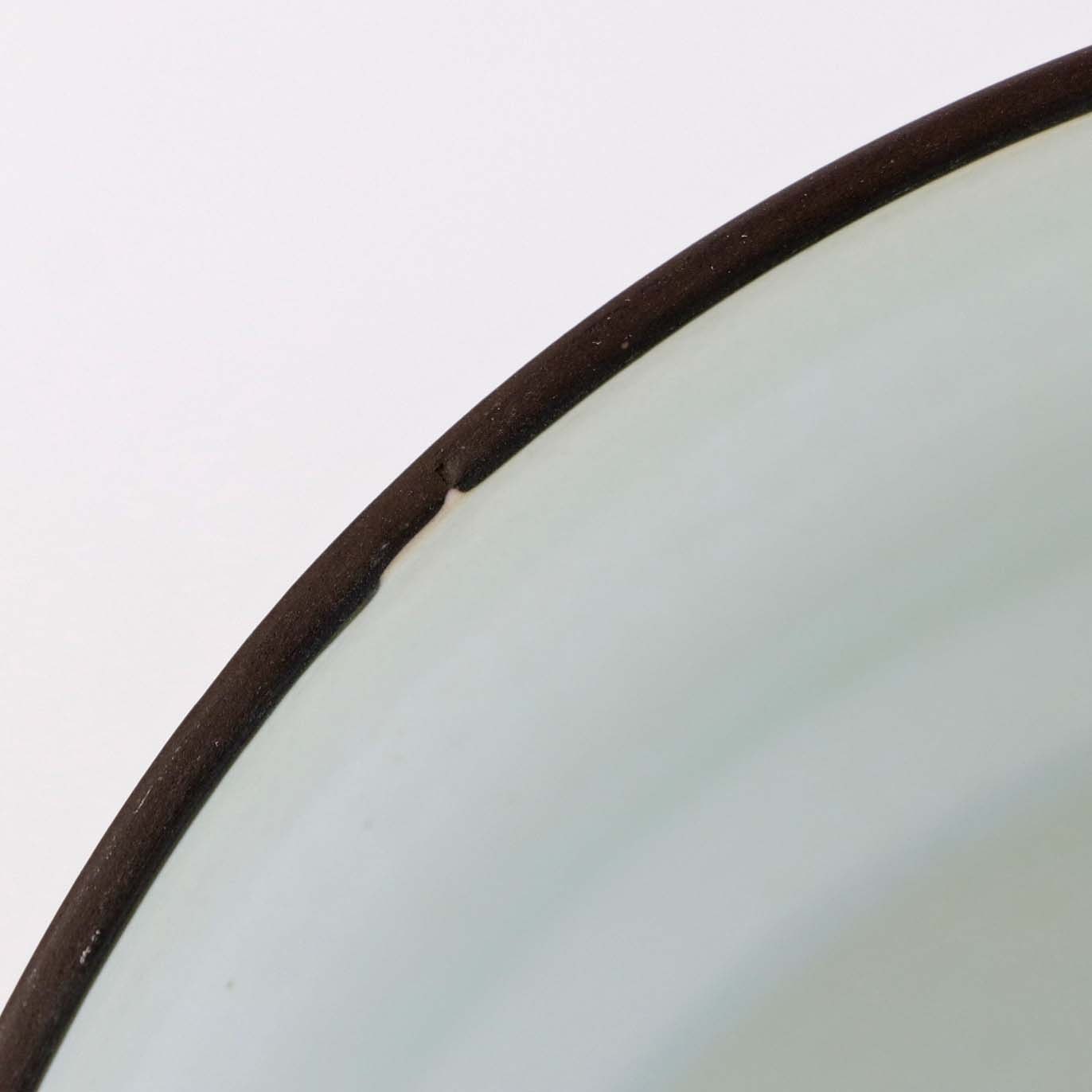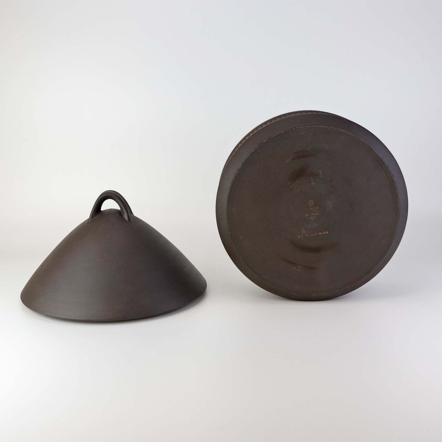 Fremstår med mindre ujævnhed ved skålens kant, enkelte sorte nister i glasuren på skål og låg samt brugsspor under bunden.