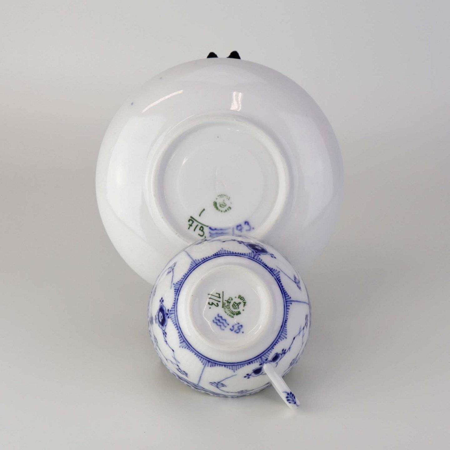Mellemstor tekop med underkop i kongeligt porcelæn fra stellet Musselmalet Halvblonde. Nr. 1/713Design Arnold Krog