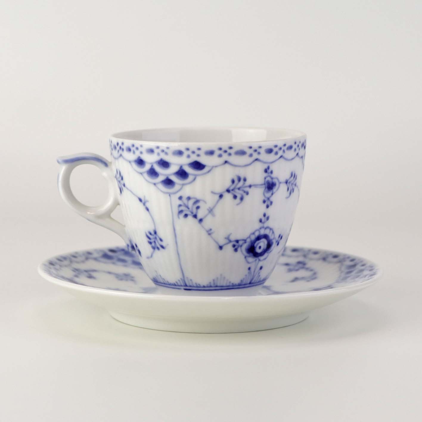 Musselmalet halvblonde er riflet hvidt porcelæn med dekoration af blå ranker og en kant med blonder.