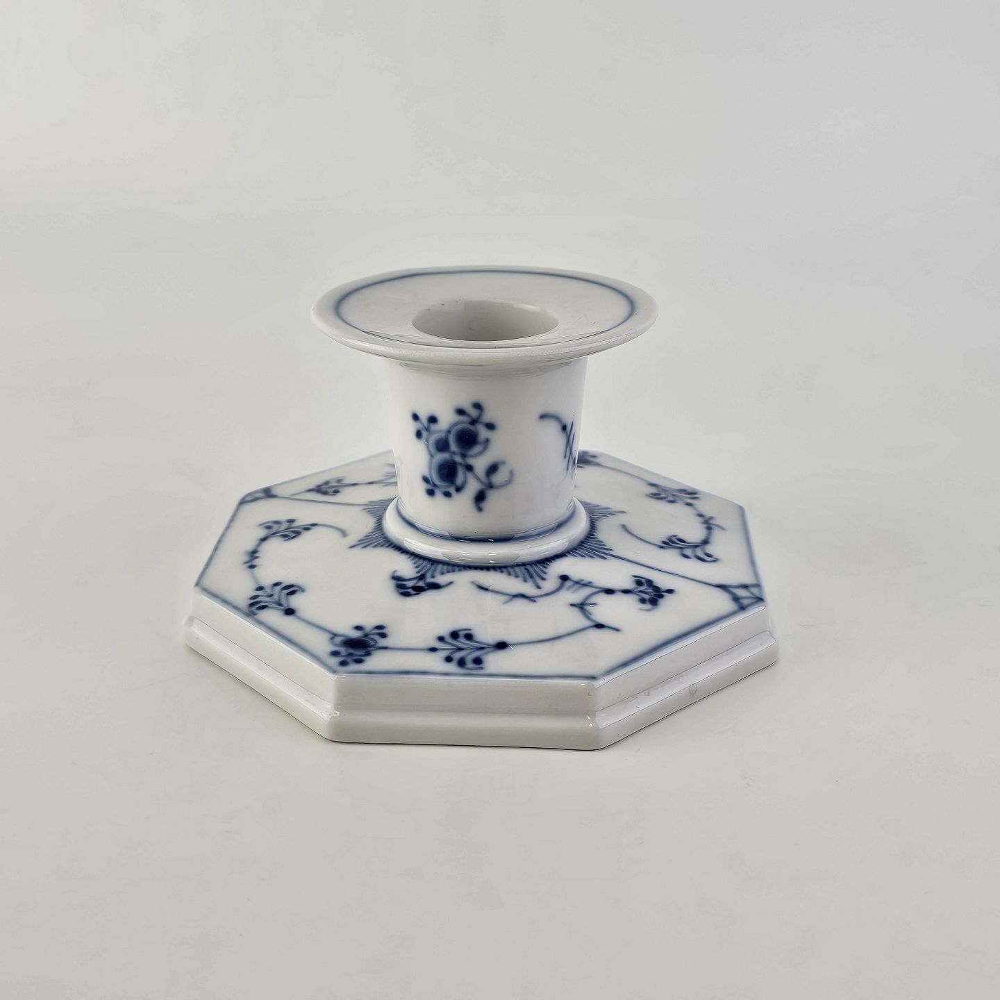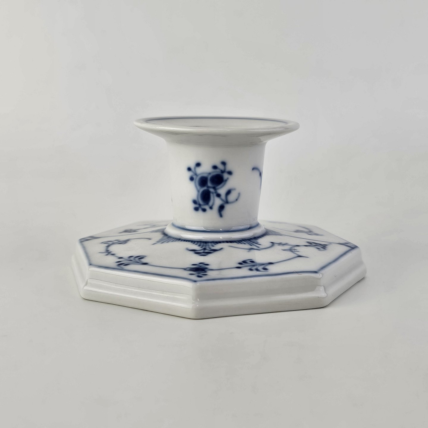 Musselmalet er af kongeligt hvidt porcelæn, dekoreret med mønster af blå ranker og blomster