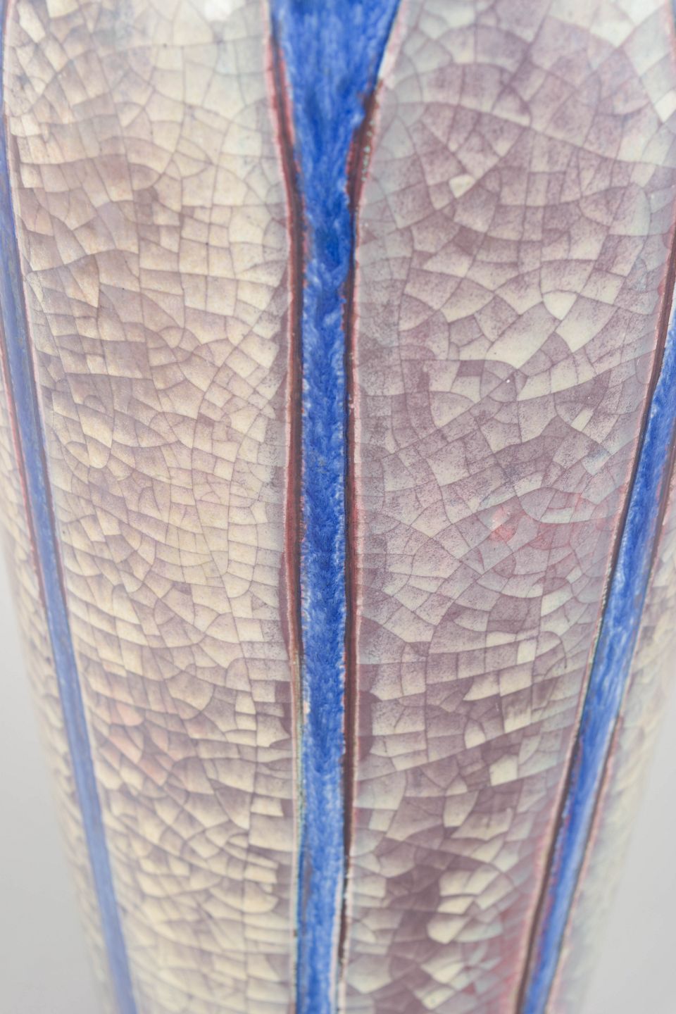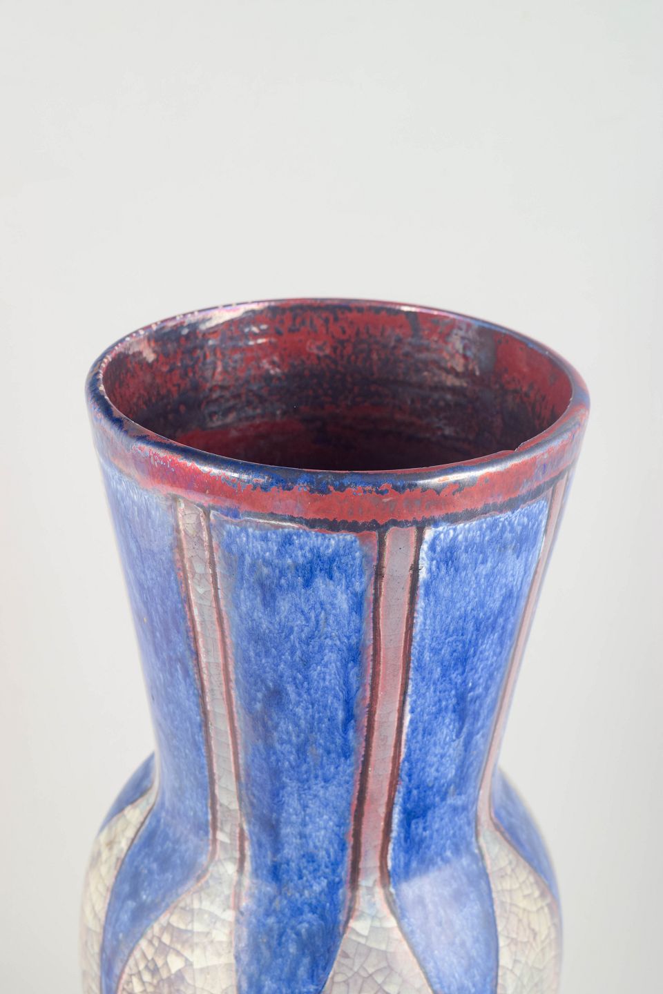 Imponerende højt skaftet vase i keramisk lertøj med stærk iriserende glasur i blå, sølv og røde nuancer. Den facetterede, geometriske form er karakteristisk for Starcks arbejde hos Michael Andersen på Bornholm.