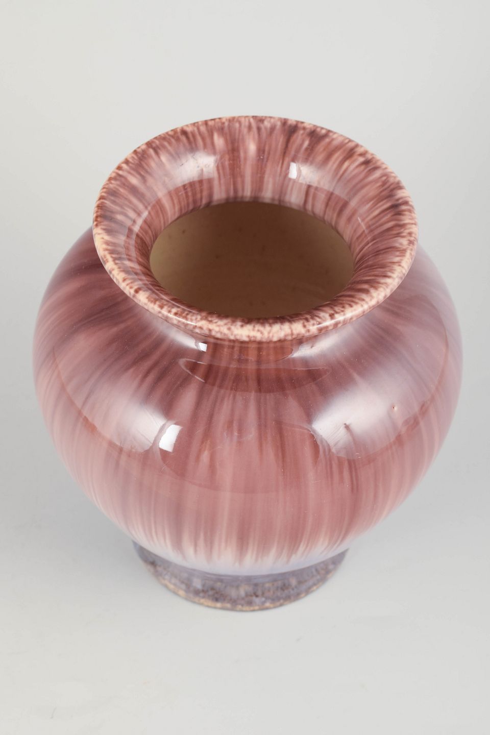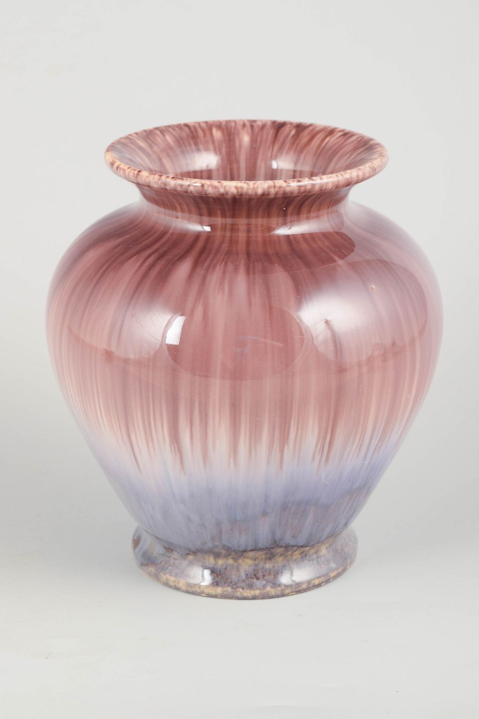 Klassisk formet stentøjsvase med bred munding og en flot, lodret løbende glasur i rosa nuancer, der glider ned i blålige toner mod bunden. En dekorativ og tidstypisk glasurteknik fra periodens studiokeramik.