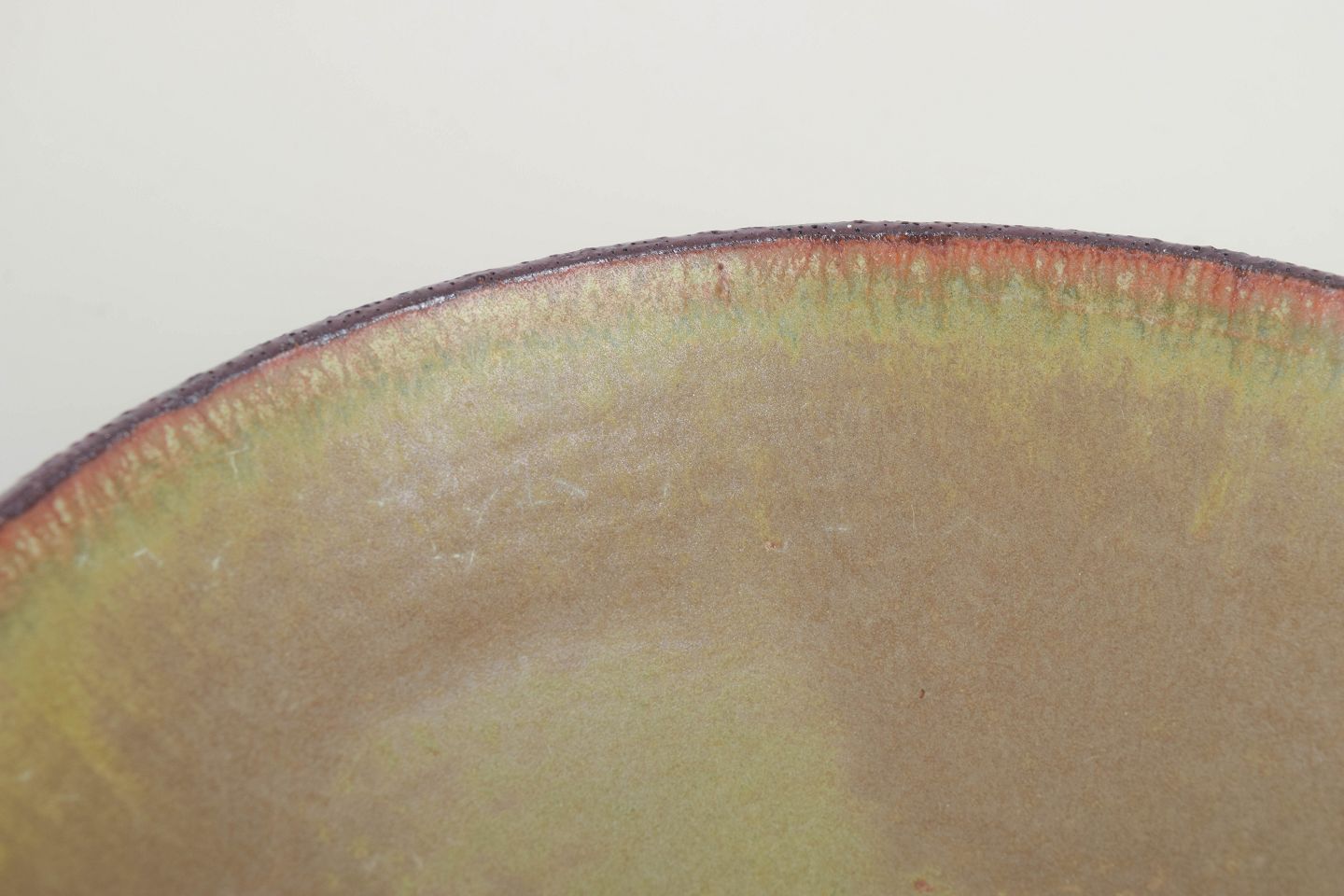 Hånddrejet skål i stentøj med let konisk form, underskål og en smuk glasur i varme grønne og brunlige nuancer.