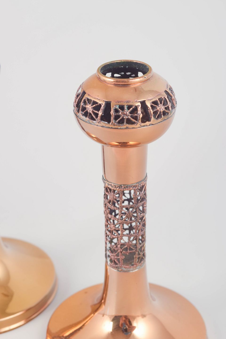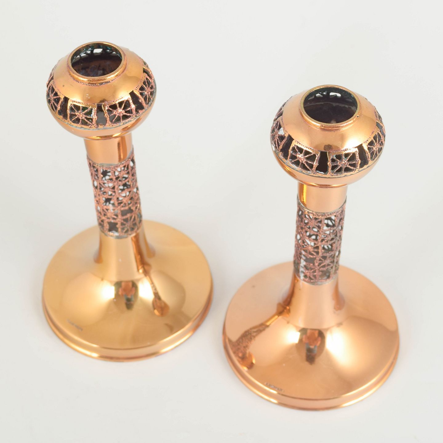 Dekorative lysestager i poleret messing med karakteristiske gennembrudte bånd i Sarpanevas organiske, smykkelignende formsprog. Et markant par fra den finske designtradition.