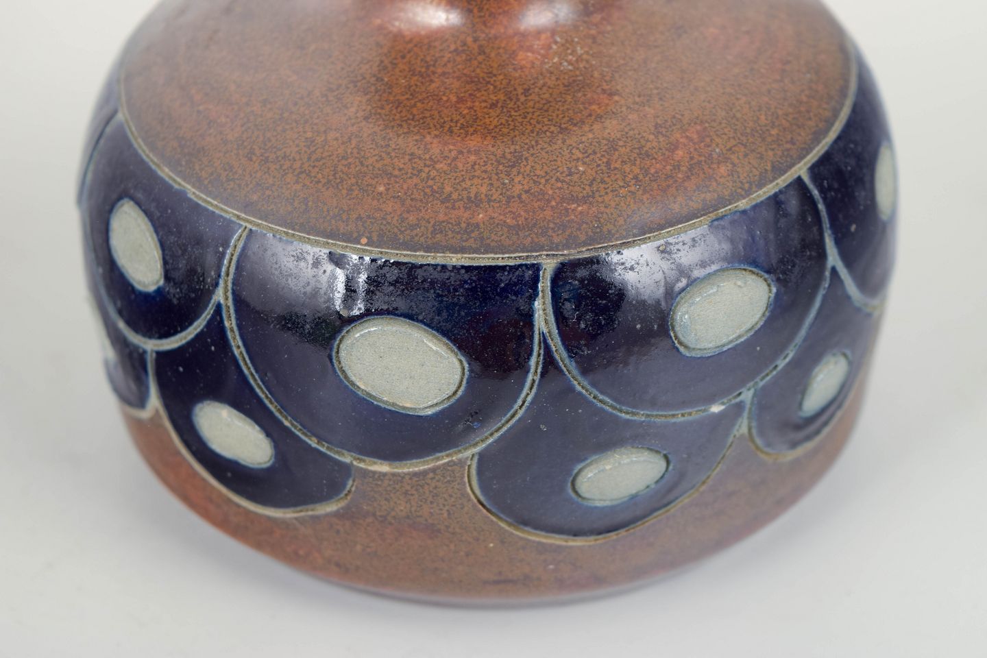Goebel, Tyskland, Vase, 1970/80’erneUnika håndlavet stentøjsvase i afrundet form med kort hals og dekorativ bånddekoration i dybblå og lyse felter.