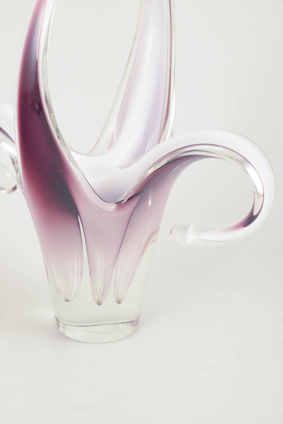 Stor og dramatisk “Coquille”-form i flerlaget kunstglas med lys rosa til violet farvegraduering, hvidt mellemlag og klart yderglas. De opadstræbende, bølgende arme giver et elegant, blomsteragtigt og skulpturelt udtryk – et af Kedelvs mest karakteristiske formsprog.