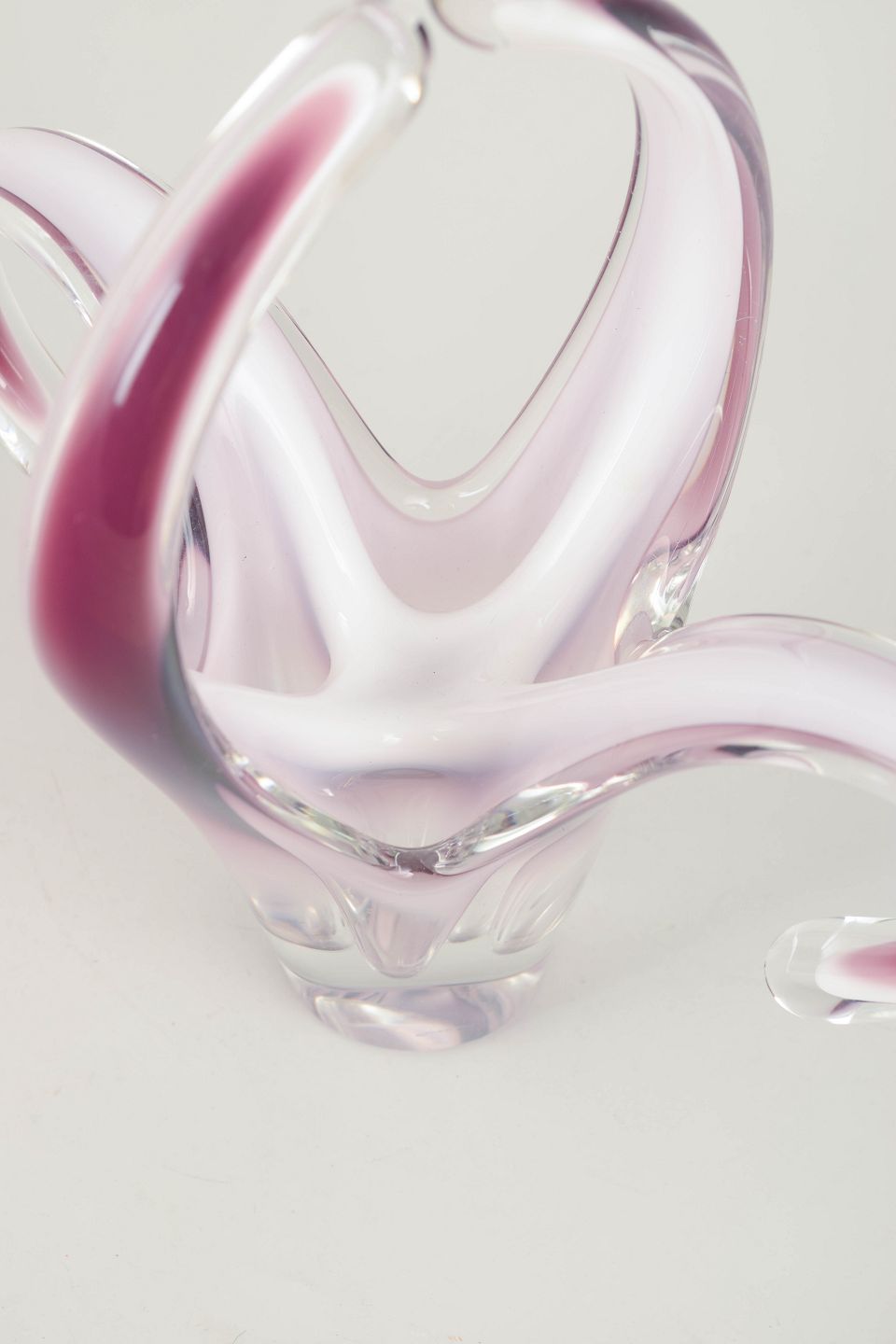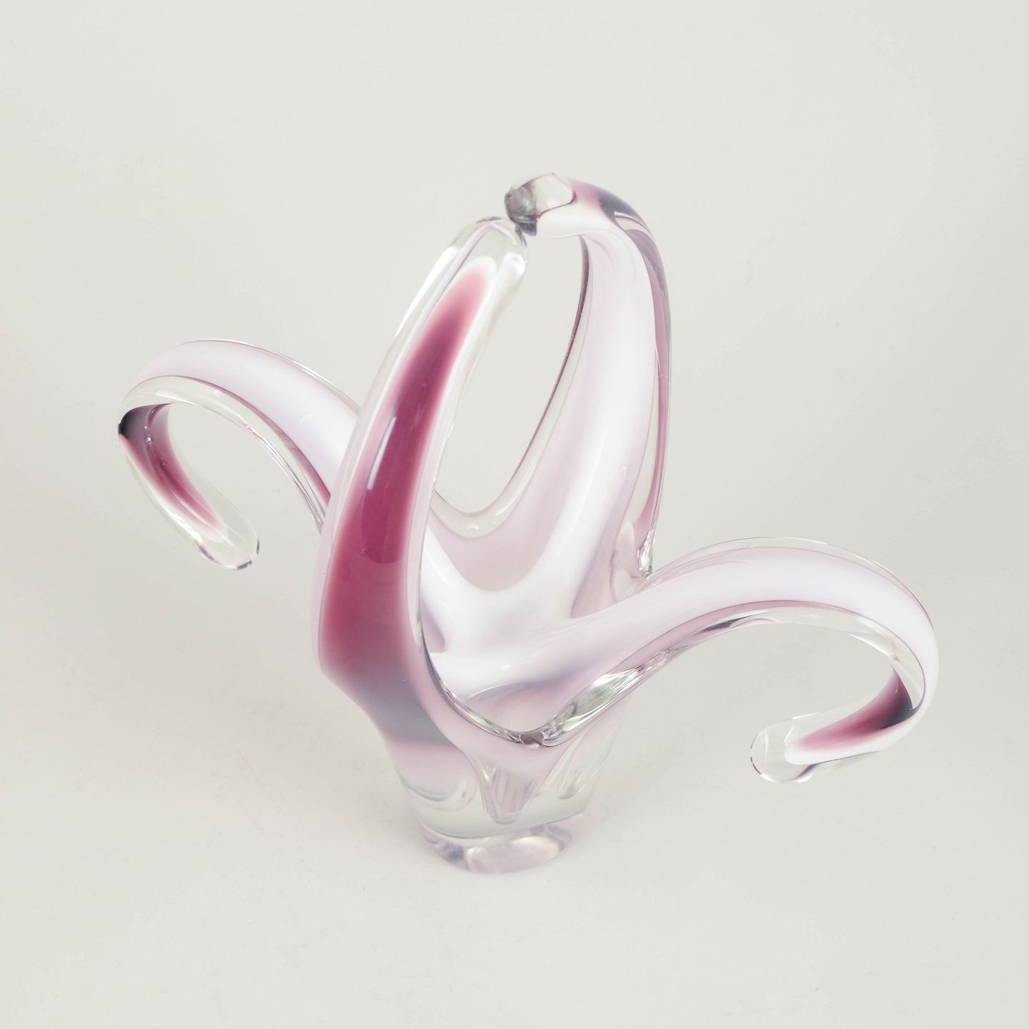Imponerende flerarms “Coquille”-skål i flerlaget kunstglas med rosa indfarvning, hvidt mellemlag og klart yderglas. De tre svungne, opadstræbende arme giver et markant, næsten blomsteragtigt udtryk, typisk for Kedelvs mest skulpturelle arbejder.