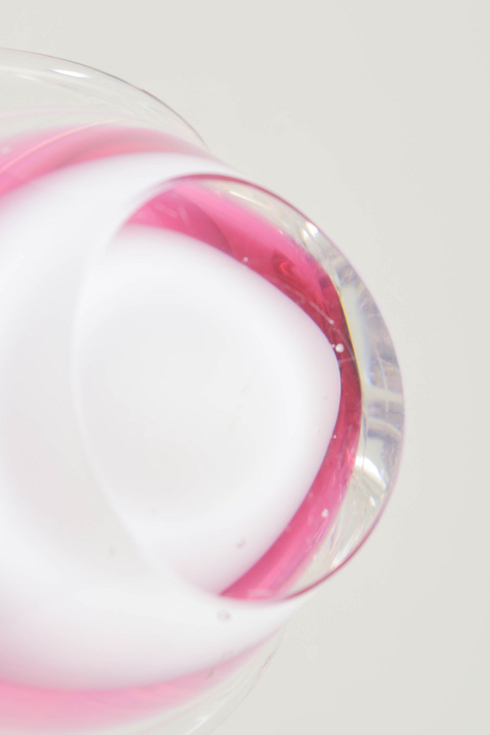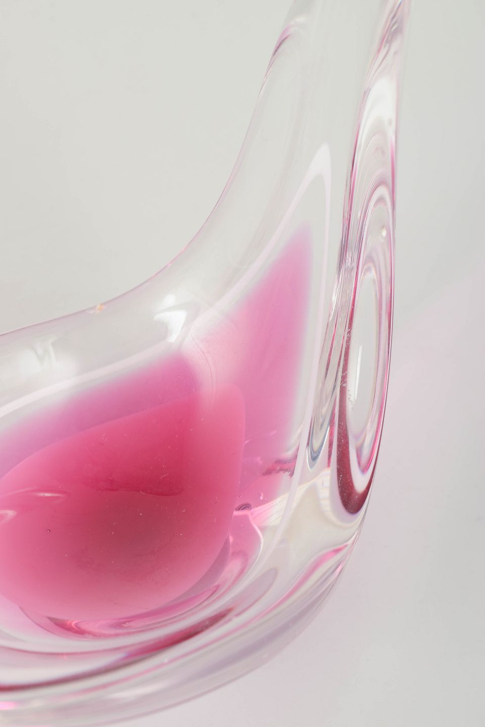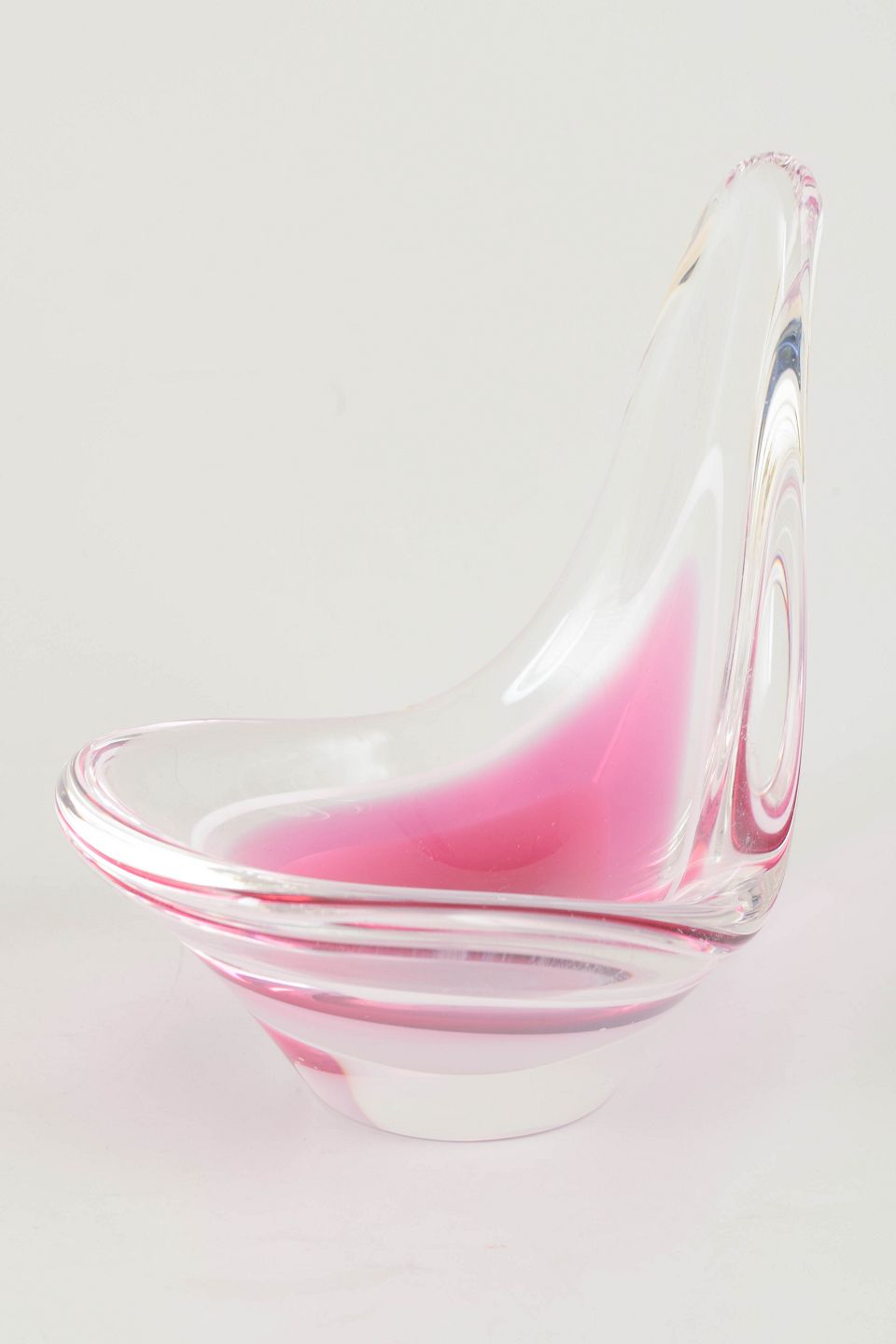 Elegant “Coquille”-skål i flerlaget kunstglas med rosa indfarvning og klart yderlag, udført i den karakteristiske asymmetriske, opadbuede form, som kendetegner Kedelvs organiske glasdesign.