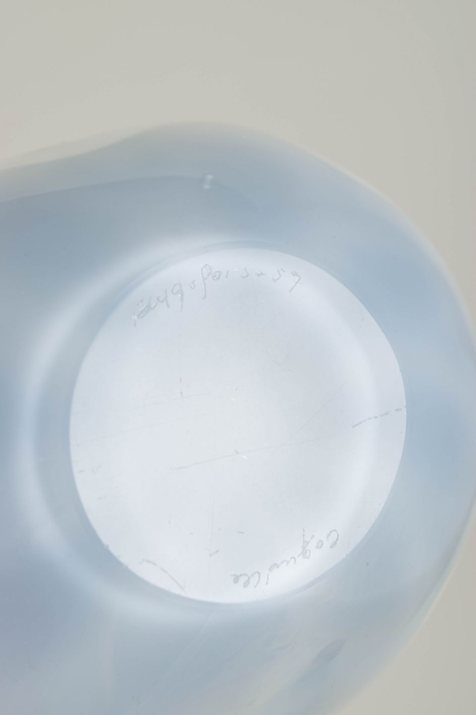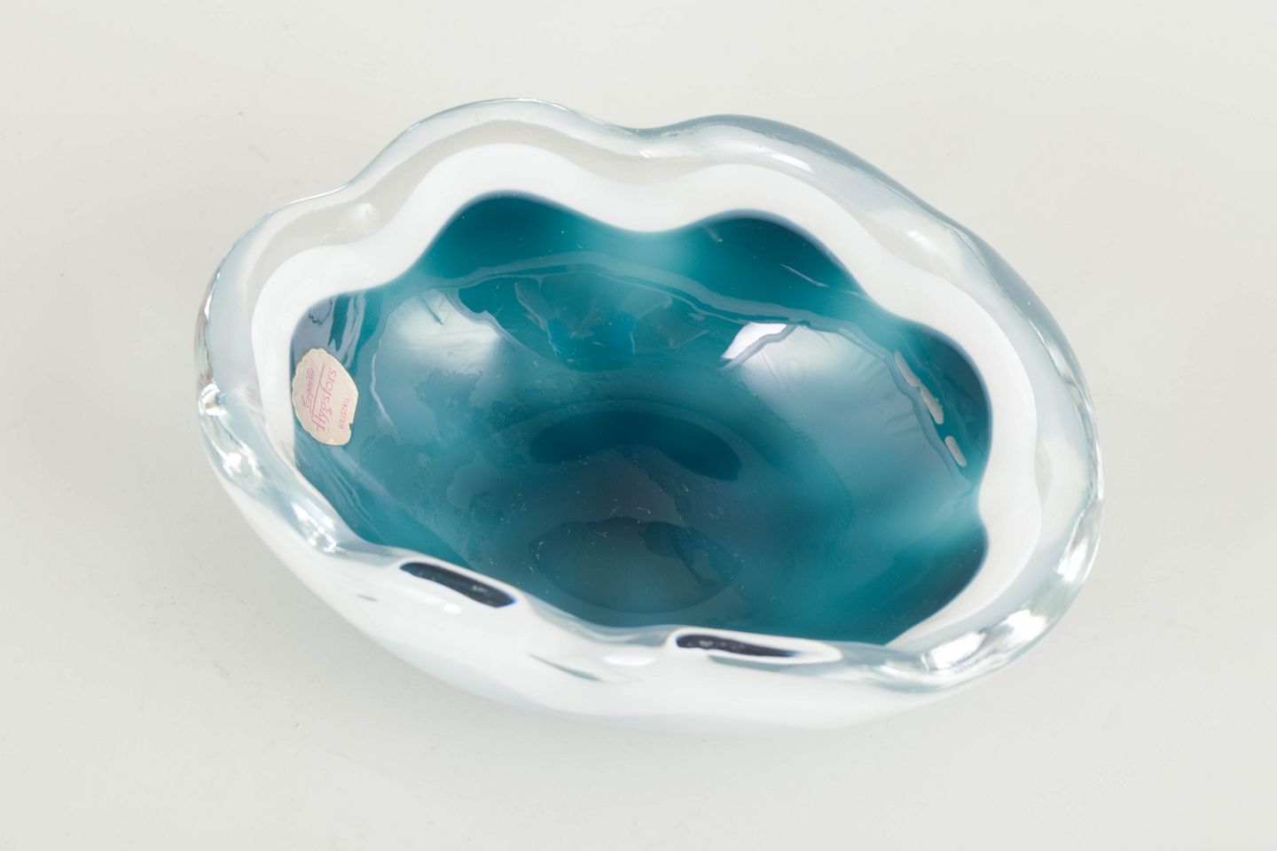 Organisk formet “Coquille”-skål i flerlaget kunstglas med turkis og hvid indre farvelægning samt klar yderste glaslag.