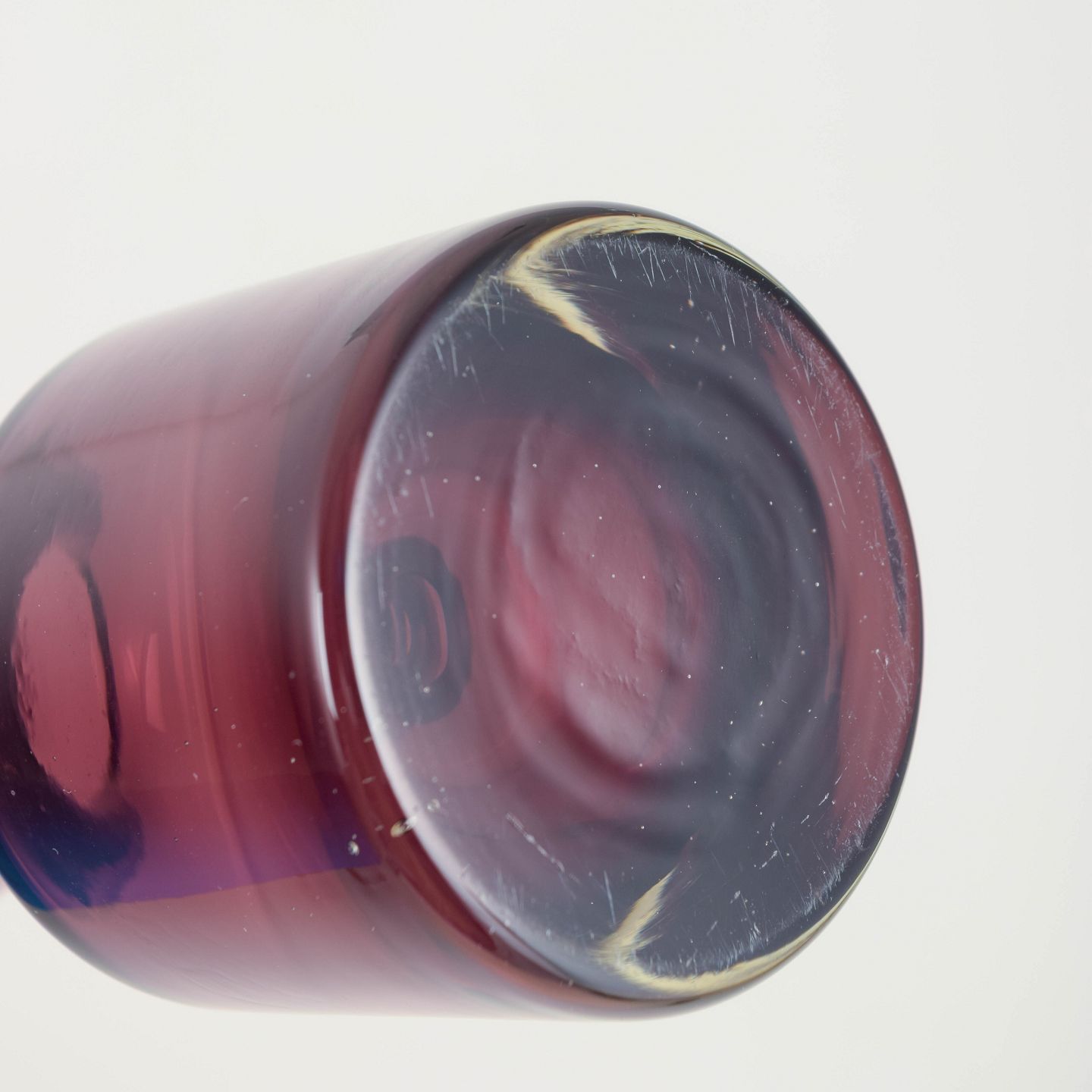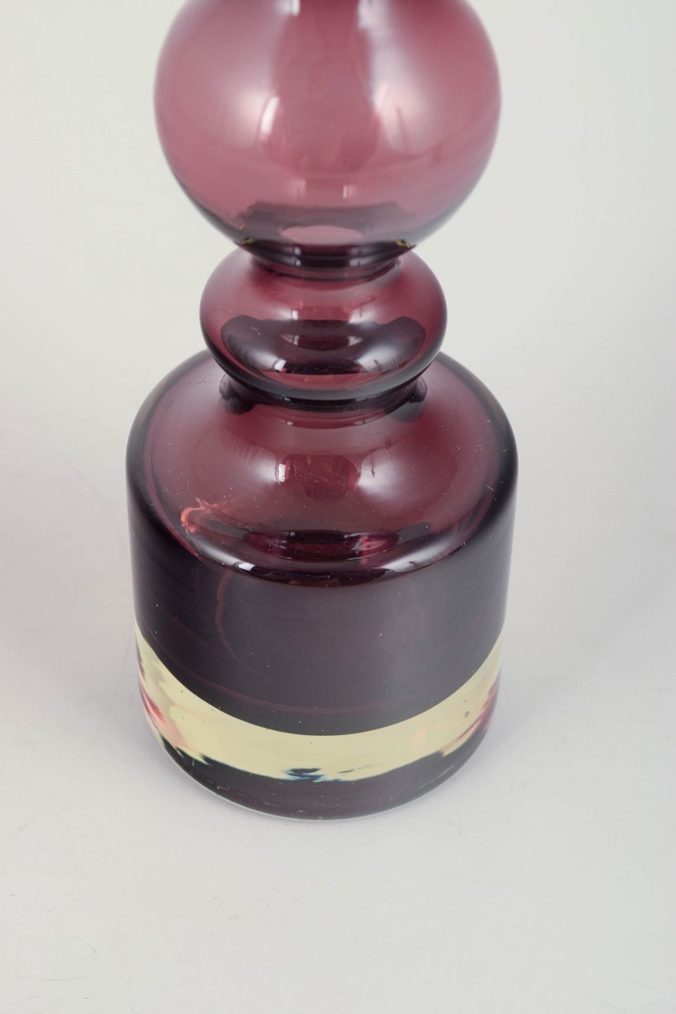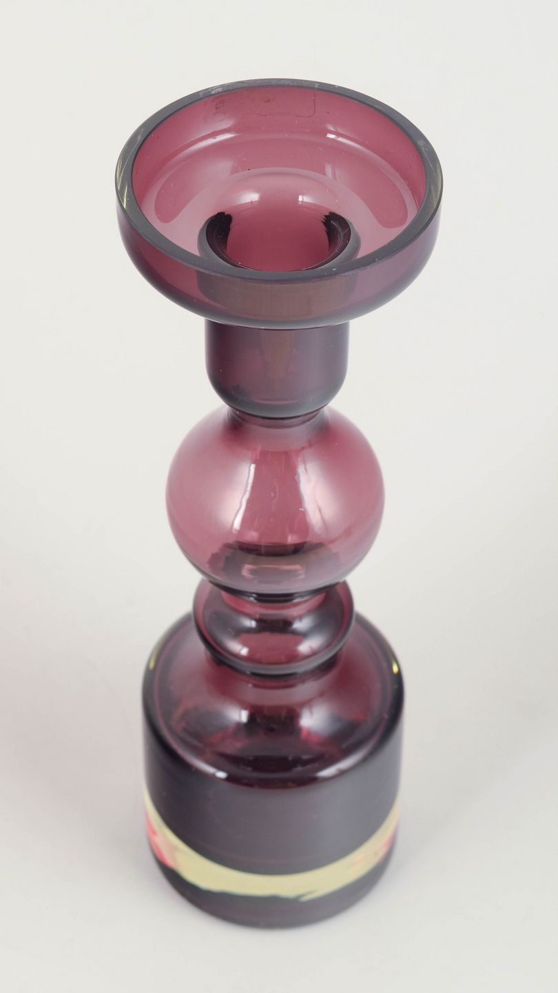 Elegant finsk glaskunstvase i den ikoniske Pompadour-form med balusteropbygget korpus, udført i dyb bordeaux-lilla glas med klart bundparti.
