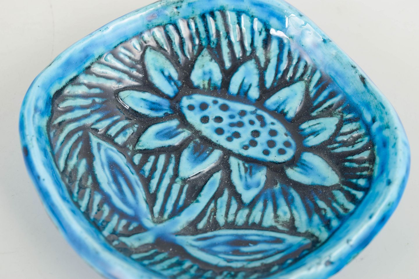 Håndformet skål i keramik med levende turkisblå glasur og indridset dekor i form af stiliseret blomstermotiv. Et karakteristisk eksempel på Nylunds organiske formsprog og farverige udtryk fra perioden.