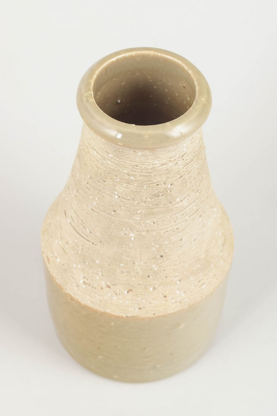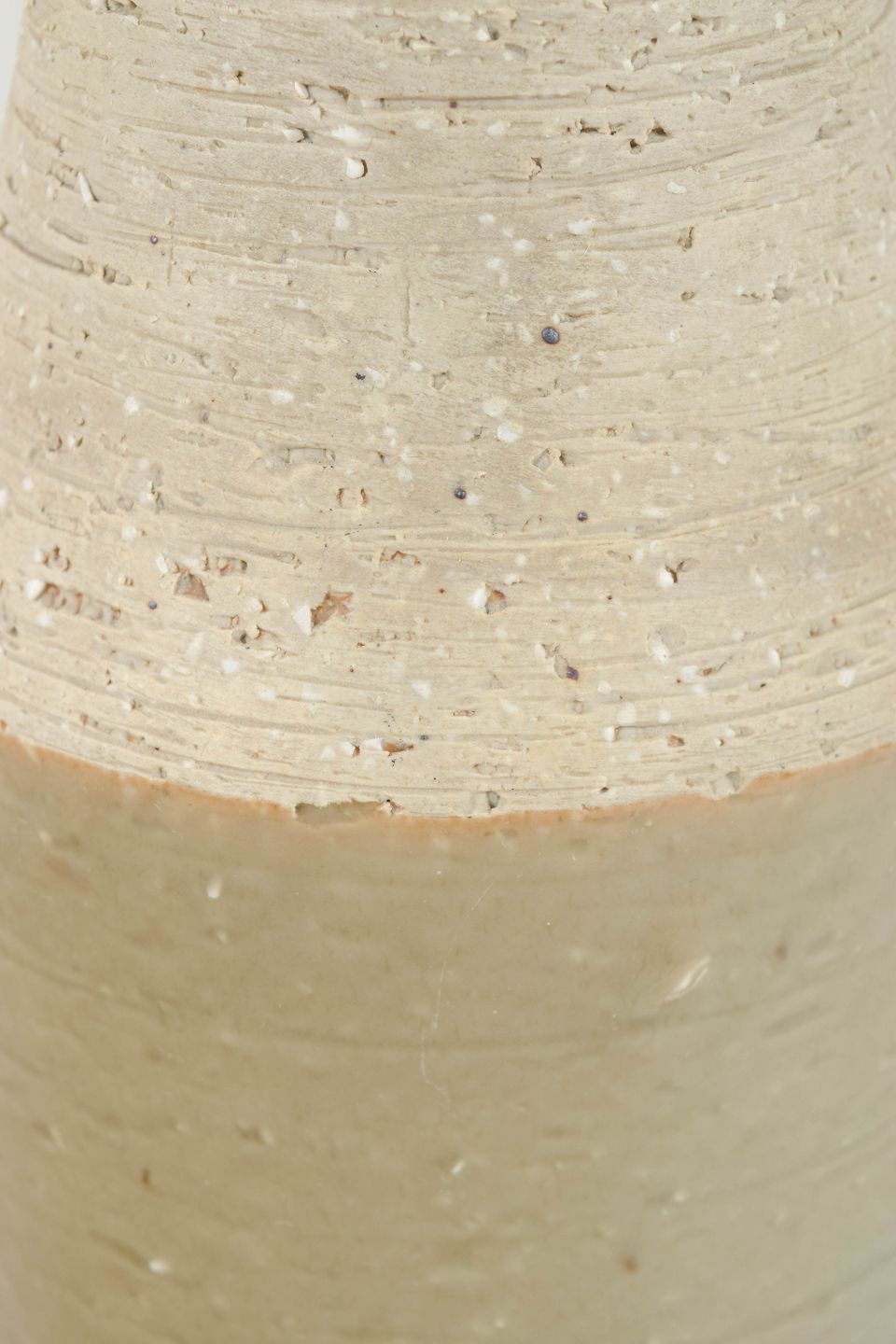 Cylindrisk vase i stentøj med kombination af glaseret og uglaseret overflade. Den øverste del har en rå, taktil struktur, mens den nederste del er glaseret i en lys beige/grønlig tone.