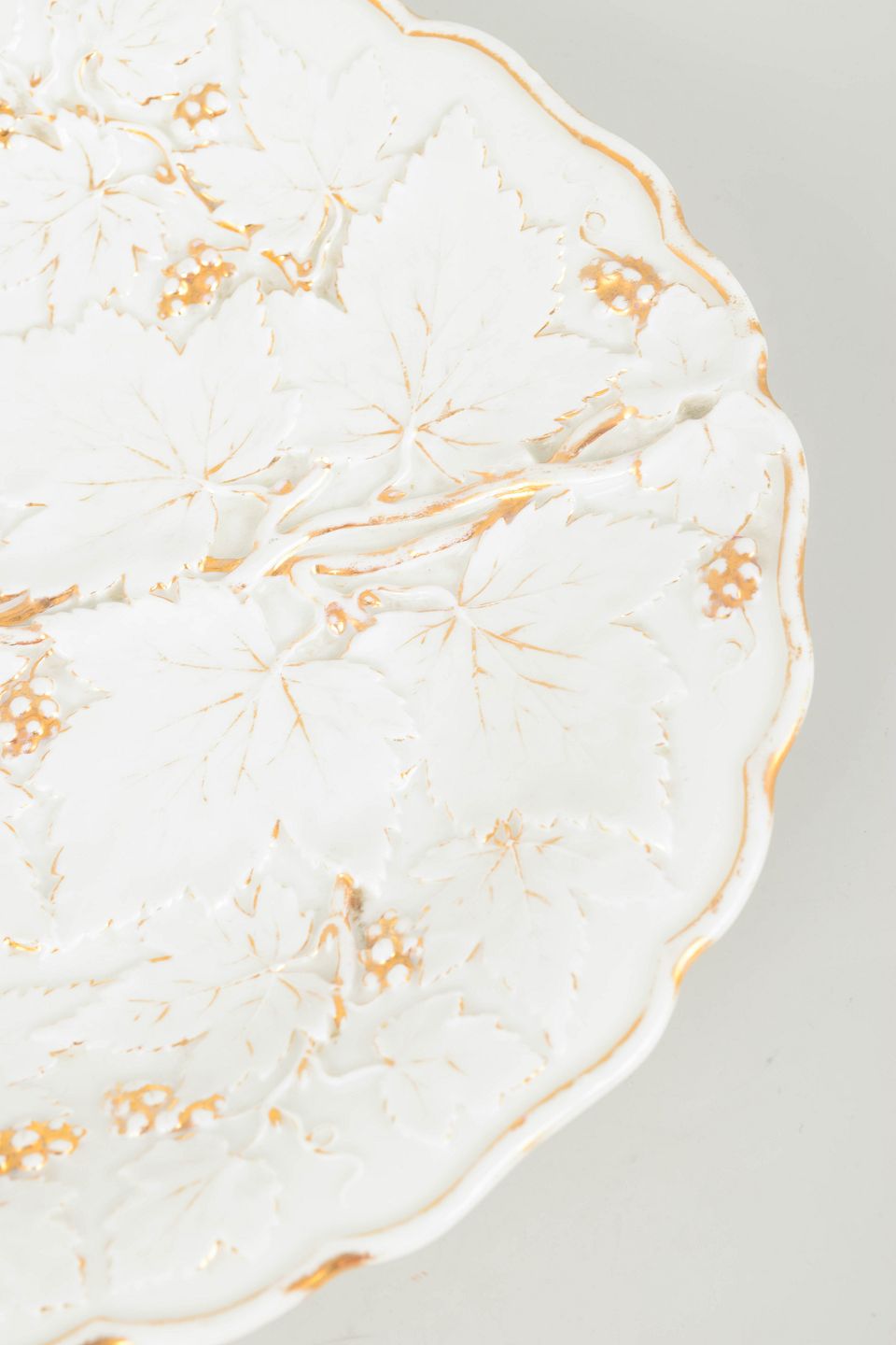Porcelænsfad fra Meissen med reliefformet bladdekor og håndmalede gulddetaljer. Et elegant og klassisk sen-1800-tals stykke med bølgede kanter og fint udførte naturmotiver.