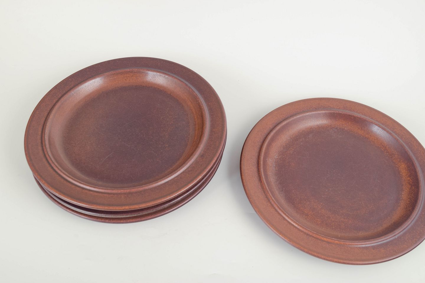 Fire middagstallerkener i mørkebrunt stentøj fra Arabia’s ikoniske “Ruska”-serie, kendetegnet ved den robuste chamotte-krop og den dybe, matbrune jernglasur med naturlige nuancer.